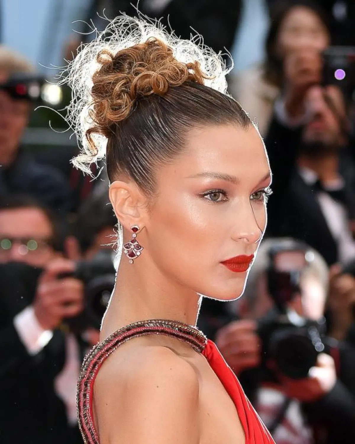 إذا كنت من صاحبات الشعر الكيرلي القصير، وتحبين تسريحات الشعر المرفوعة، بإمكانك الحصول على أجمل إطلالة عصرية ومميزة، وذلك بأسلوب عارضة الأزياء العالمية بيلا حديد، بحيث تعتمدين تسريحة الكعكة العالية مع الخصل الكيرلي البارزة من الخلف، مع الغرة النصفية المشدودة الى الخلف.