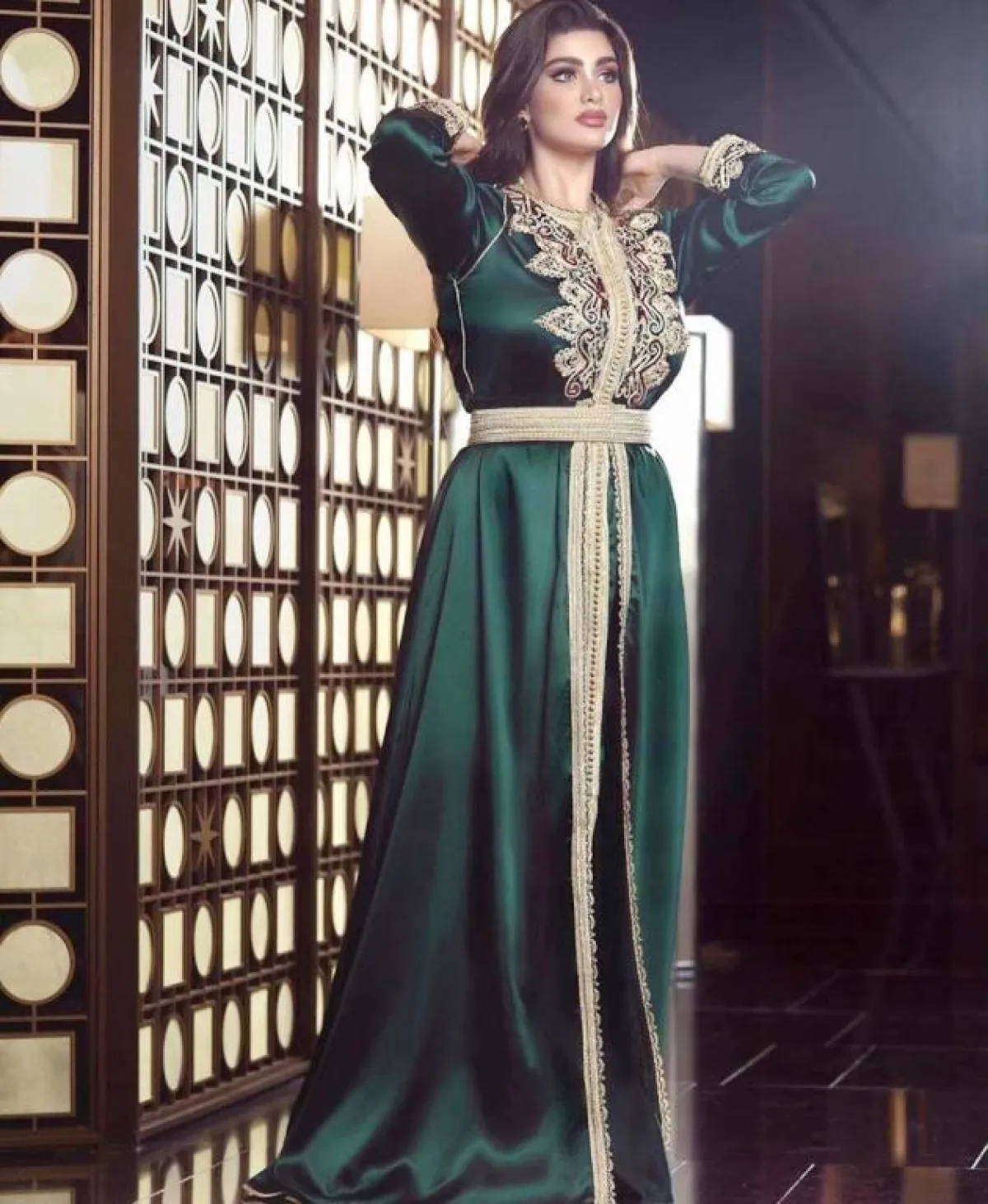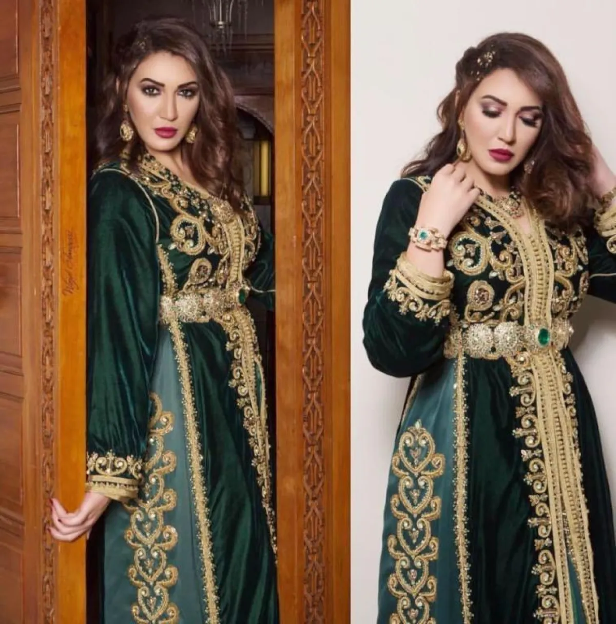 أما بسمة بوسيل فاختارت قفطانًا بدرجة داكنة وأكمام شفافة مليئة بالنقوش الذهبية وعلى منطقتي الصدر والمنتصف، بينما جاءت سلمى رشيد بقفطان باللون الأخضر الداكن المُزيَّن بالذهبي على منطقتي الصدر والأطراف.