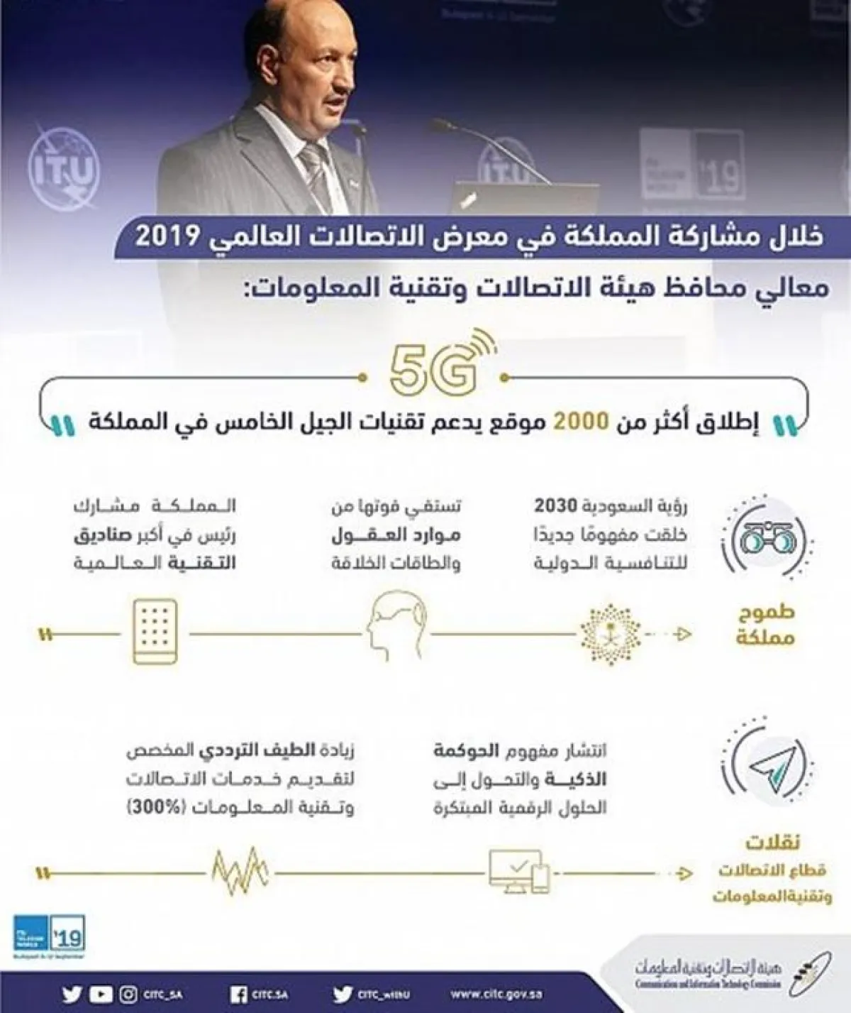 واستعرض الرويس القفزات النوعية التي حققها قطاع الاتصالات في المملكة خلال العامين الماضيين، بما فيها زيادة الطيف الترددي المخصص لخدمات الاتصالات وتقنية المعلومات بأكثر من 300%؛ لتكون بذلك ثاني دول العشرين في مجموع النطاقات الترددية عالميًا، مضيفًا، لهذه المنجزات احتفال المملكة مؤخرًا بإطلاق أكثر من 2000 موقع تدعم تقنيات الجيل الخامس 5G، وكذلك تجهيز مطار "نيوم" كأول مطار في الشرق الأوسط وإفريقيا يدعم تقنيات الجيل الخامس 5G، وإيصال الألياف البصرية لأكثر من 3 ملايين وحدة سكنية ومنشأة حكومية وغيرها.