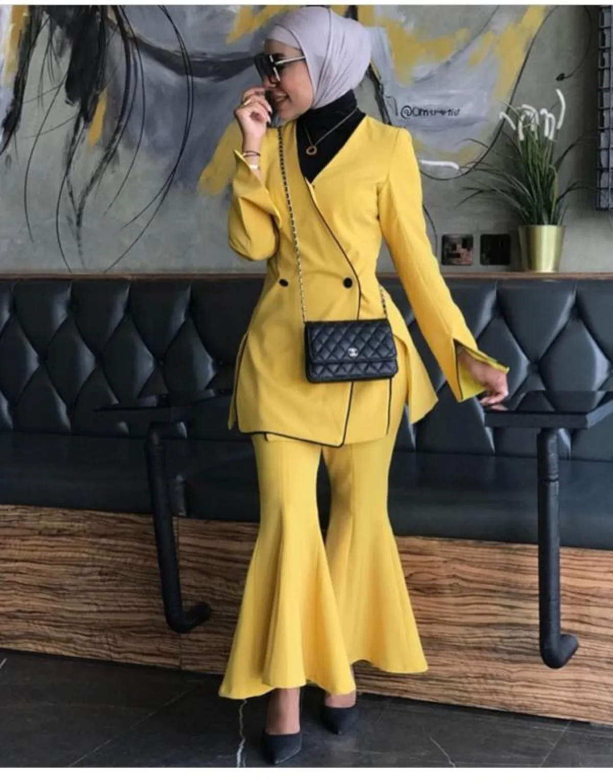 مع ظهور موضة البدل بشكل عام، لِمَ لا تعتمدينها بطريقة مختلف على طريقة الفاشنيستا أوشا الحازم للبدلة باللون الأصفر، مع بنطلونها ذي القدم الواسعة المكشكشة والبليزر الـ Double Breast الطويل، لاطلالة رشيقة.