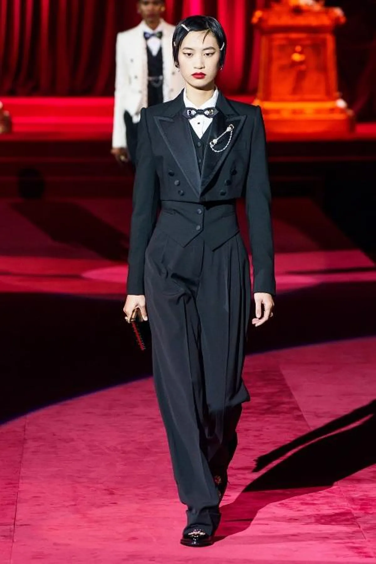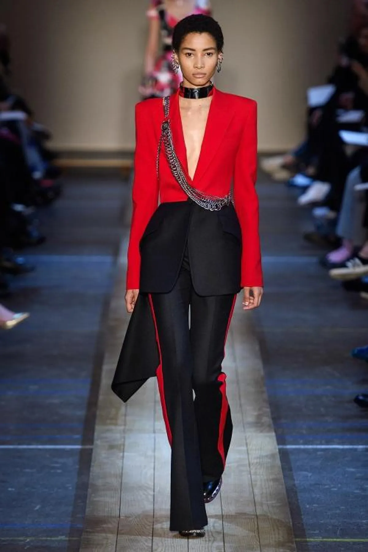 أما السيدات اللواتي لا يفضلن الكلاسيكية المطلقة، فننصحكن باختيار البدلات التي قدمها Alexander McQueen والتي تميزت بألوانها المتداخلة وبقصاتها الغريبة، كإحدى البدلات باللونين الأحمر والأسود والتي تزينت بحزام معدني.