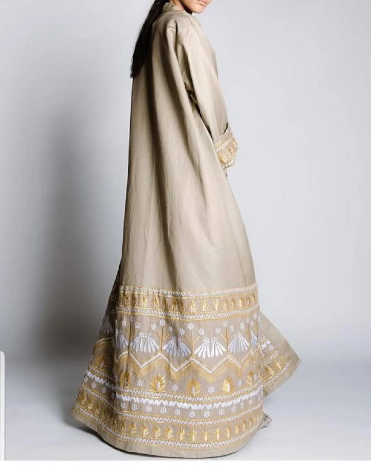 بالطبع نعرف مدى نعومة ملمس الكتان على أجسادنا، لهذا فهي واحدة من الخامات الأفضل للعبايات بمشاويرنا النهارية، مع رسومات فلكلورية على الجزء السفلي للعبايه، مثل هذا التصميم من كتان عبايه Kettan Abayasتناسب صاحبات الشخصيات المرحة وغير المتكلفة.