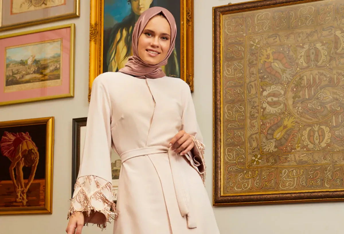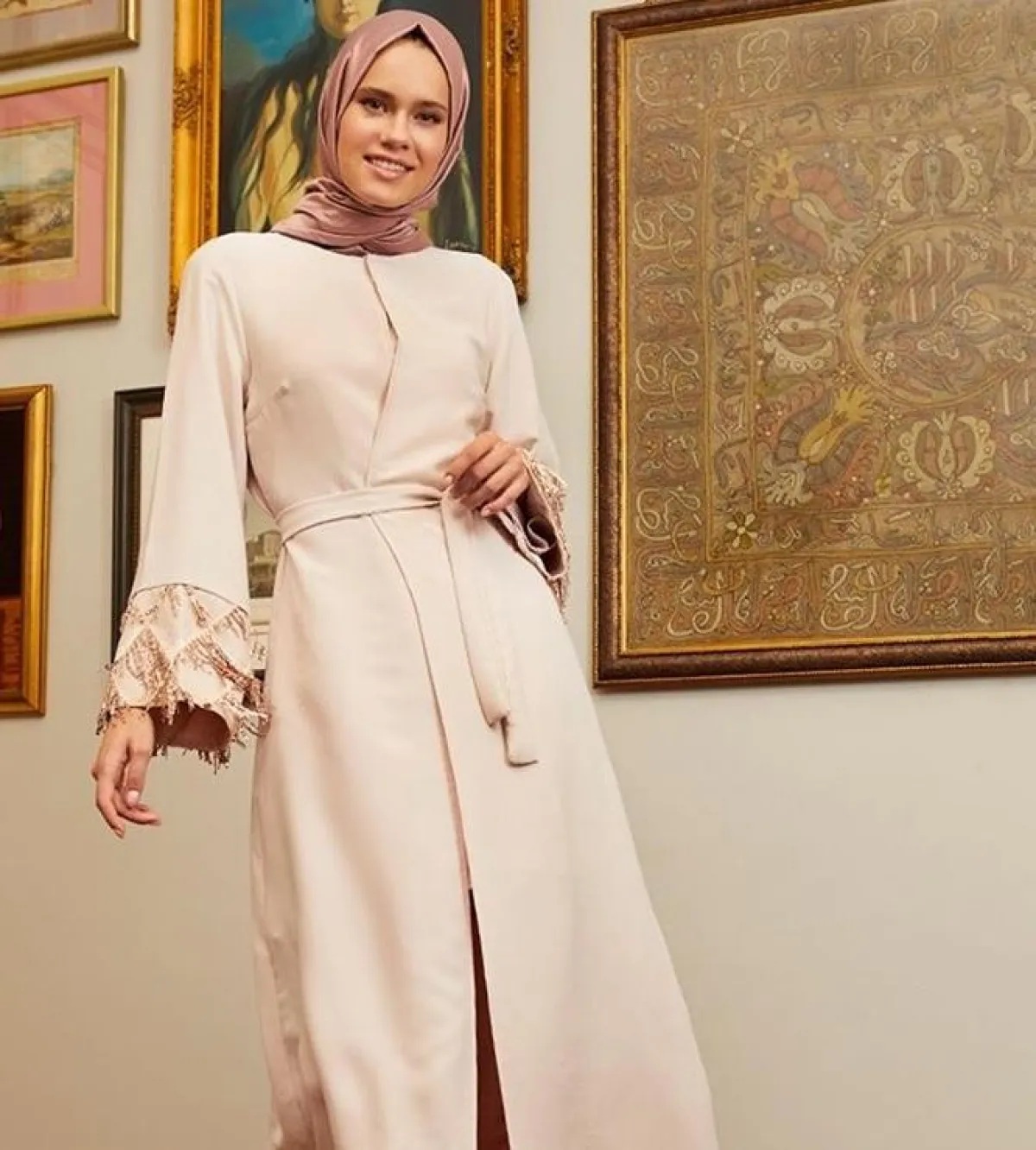 لفتنا هذا الموديل من مودانيسا Modanisa للعبايه باللون السومون بسيطة وناعمة، مقفولة بلمسة مائلة قليلًا، مع حزام الخصر، وتطريزات من الشراشيب على الأكمام للمسة شبابية، تناسب أكثر المراهقات.