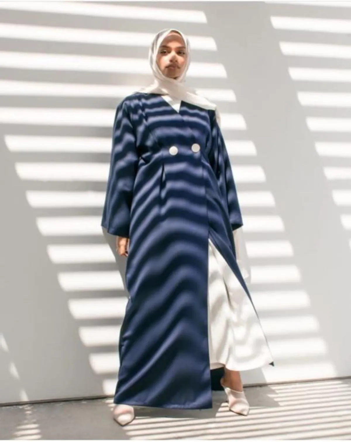 أبسط خيار يمكنكِ اعتماده في عبايات الخروج، هو اختيار تصميم بسيط من دون أيّ تطريزات، ليسهل عليكِ تنسيقه بعد ذلك مع باقي القطع والاكسسوارات لديكِ، وبلون موحد أيضًا، كهذه العبايه الزرقاء من Hessa El falasi حصة الفلاسي، مع اكسسوار من الأزرار كبيرة الحجم البيضاء على منطقة الخصر، نسقي معها دائمًا أيّ اكسسوار باللون الابيض، مع حجاب أنيق باللون الأبيض أو إحدى درجات النود.