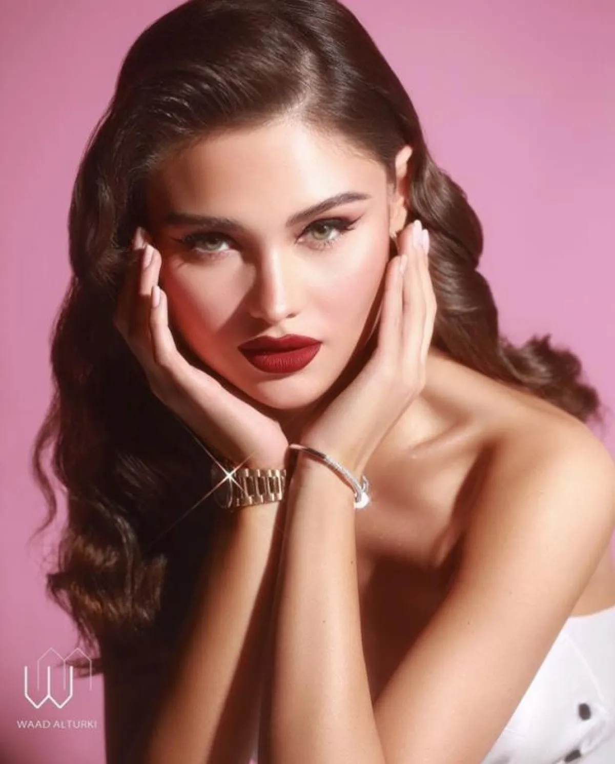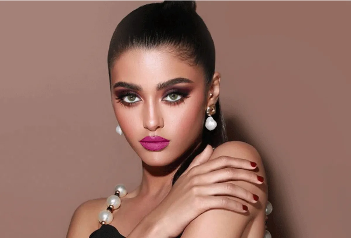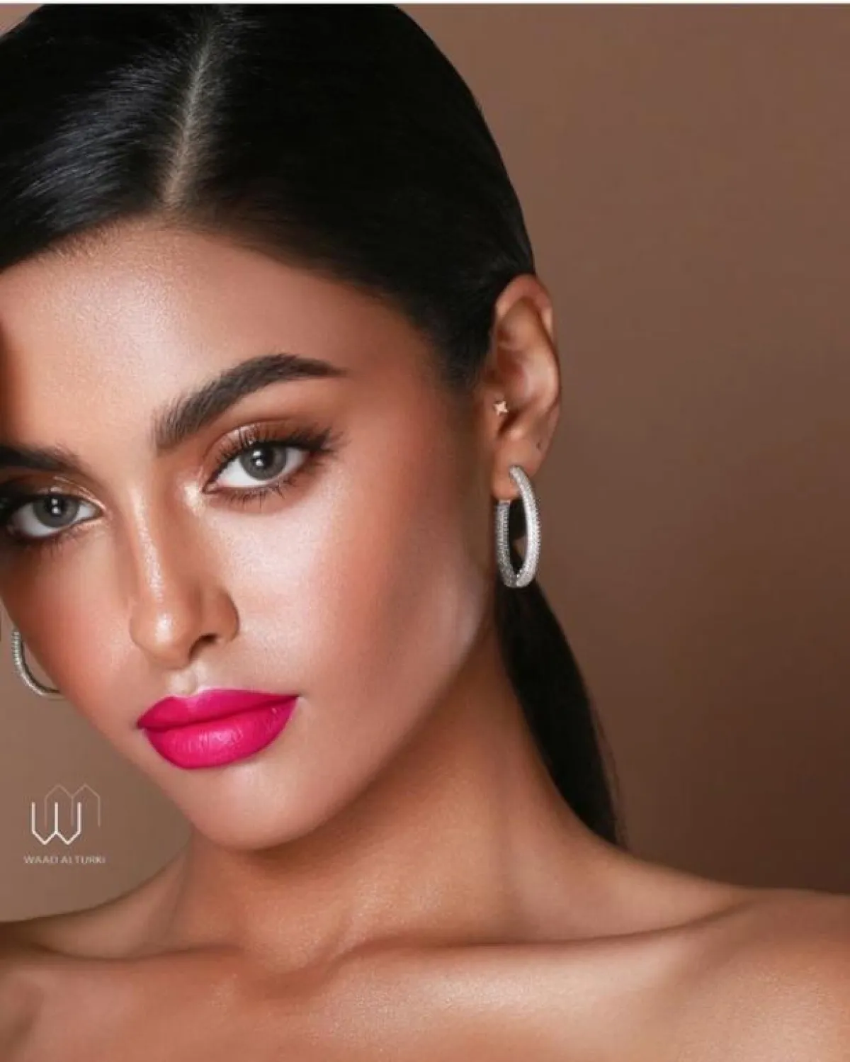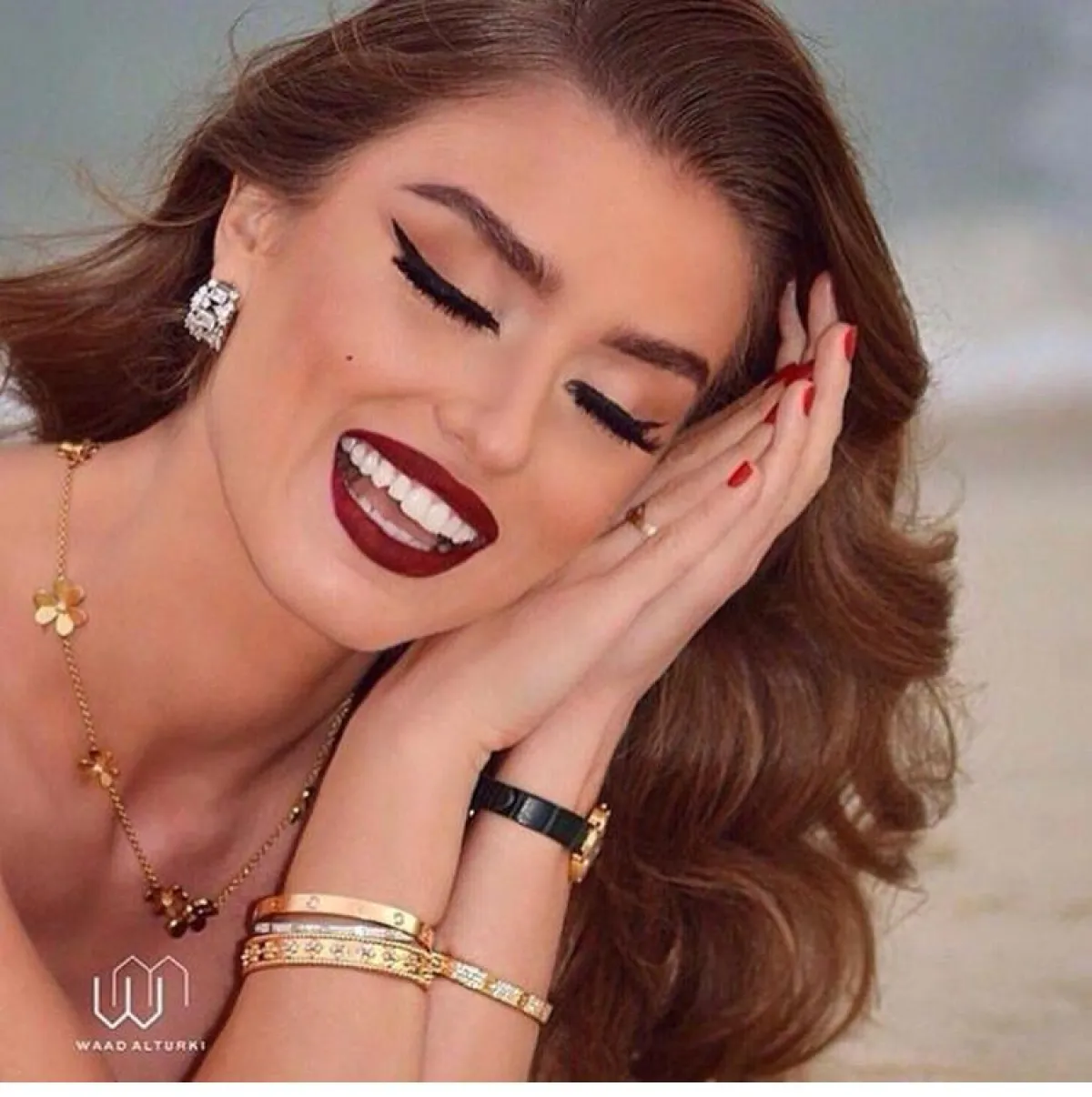 من الأفكار التي يمكنكِ تطبيقها من وعد التركي أيضًا لاطلالة كالنجمات، هو تطبيق المكياج الخمري، مع العيون المرسومة بالكحل الأسود والمروش الكثيفة، وكريم الأساسي البرونزي، ولمسات الهايلايتر الناعمة، وتكمل اللوك بأحمر الشفاه النود.