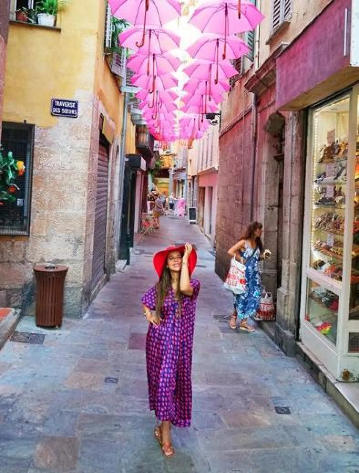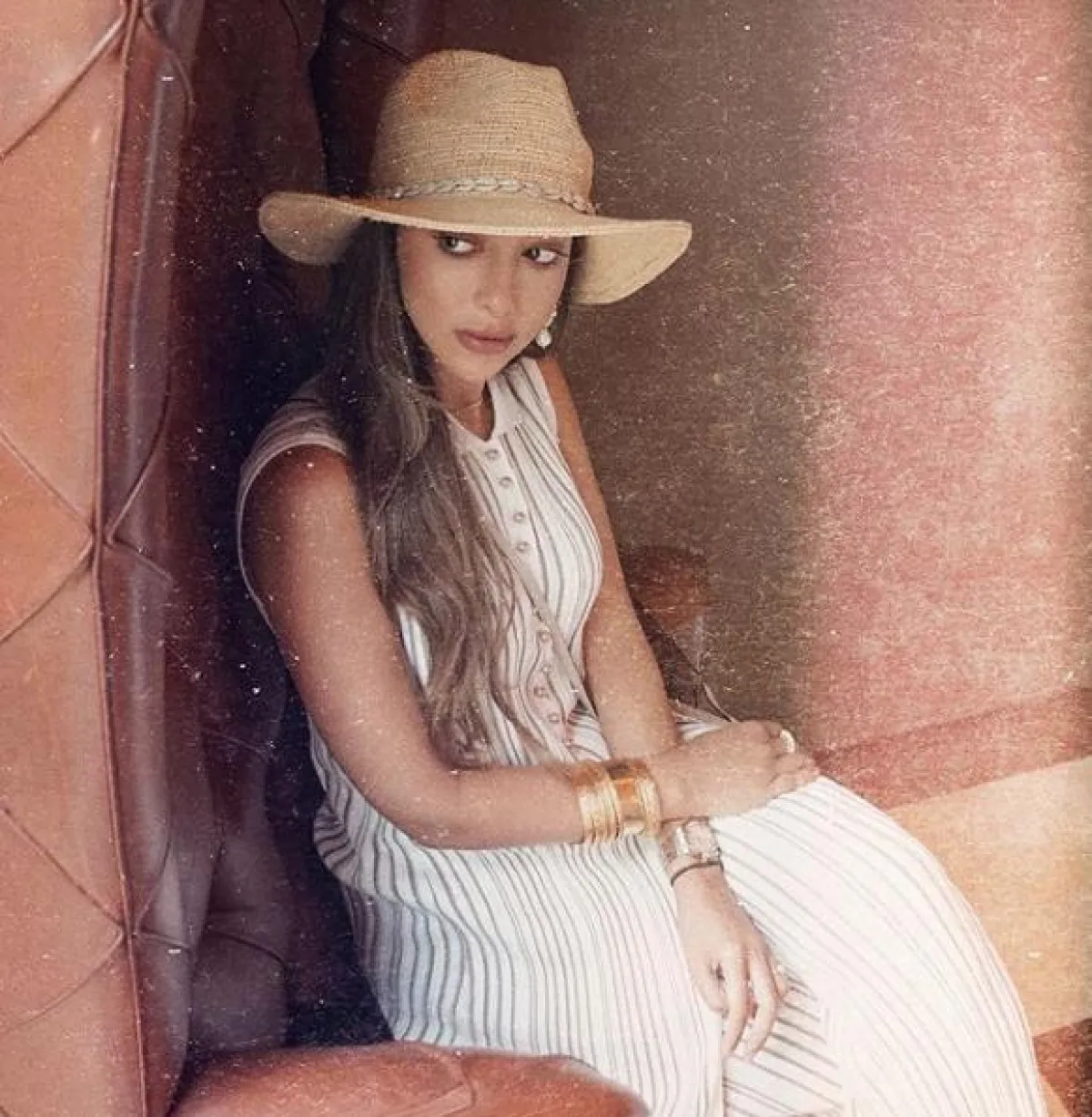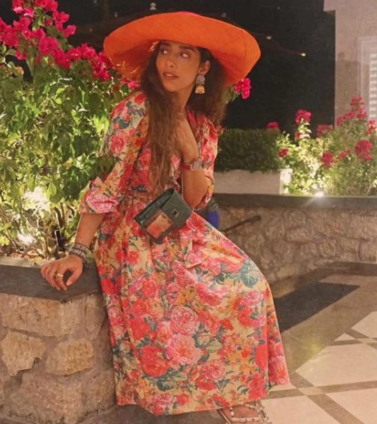 اطلالة صيفية ثانية شاهدنا بها بلقيس فتحي خلال الإجازة، جمعت فيها بين الأسلوب العملي والأسلوب الأنثوي الأنيق، حيث اختارت فستان ماكسي بقصة الجلابية بدرجات اللون البنفسجي، وقد نسقت معه صندلًا من الجلد العسلي من هرمس Hermes، وقبعة كبيرة لافتة باللون الأحمر.