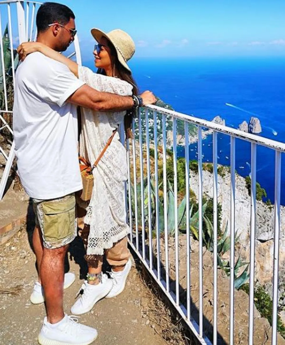 لقطة جميلة جمعت بين بلقيس فتحي وزوجها في الإجازة الصيفية، وقد بدت الاطلالتان متناسقتين، وقد اختارت بلقيس بنطلونًا بقصة واسعة باللون البيج، ونسقت معه كيمونو طويلًا من الدانتيل باللون الأبيض، وأكملت الاطلالة بحقيبة كتف وقبعة كبيرة من القش، وحذاء رياضي أبيض، أما زوجها فقد اعتمد أيضًا اللونين البيج والأبيض، حيث نسق شورت مع تيشرت قطنية وحذاء رياضي.