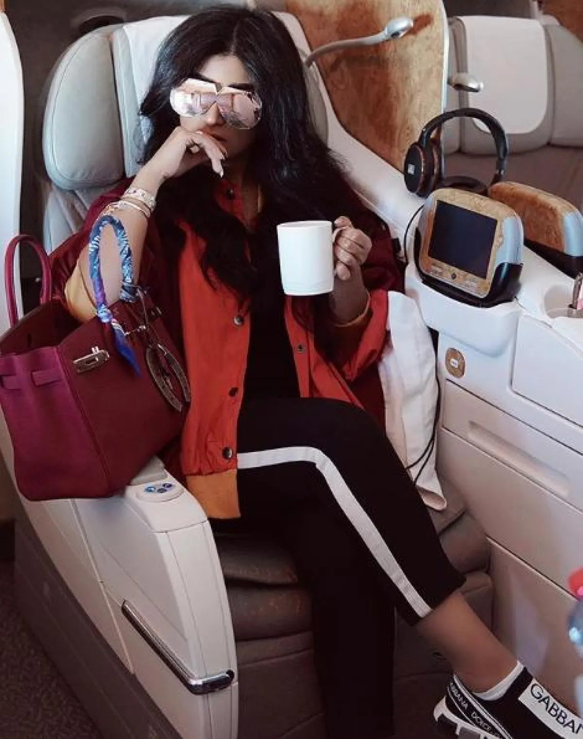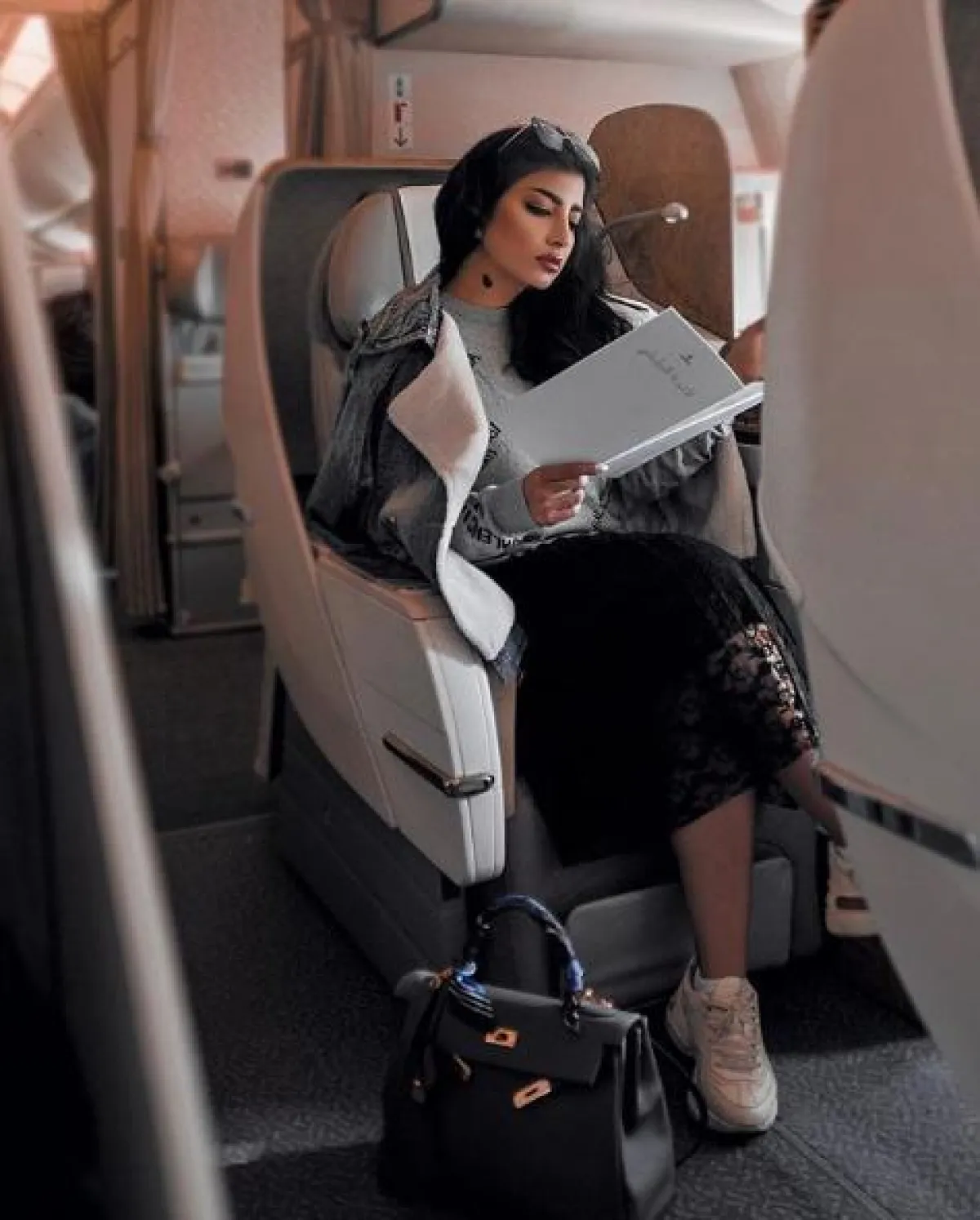 في الطائرة شاهدنا بثينة الرئيسي وقد اعتمدت لوك جمع بين الأناقة والعصرية والراحة، حيث نسقت تنورة ميدي واسعة باللون الأسود مع سويتر باللون الرمادي، ومن فوقها جاكيت جينز بتصميم شبابي، وأكملت الاطلالة بحذاء رياضي أبيض، وشنطة يد أنيقة من الجلد من هرمس Hermes.