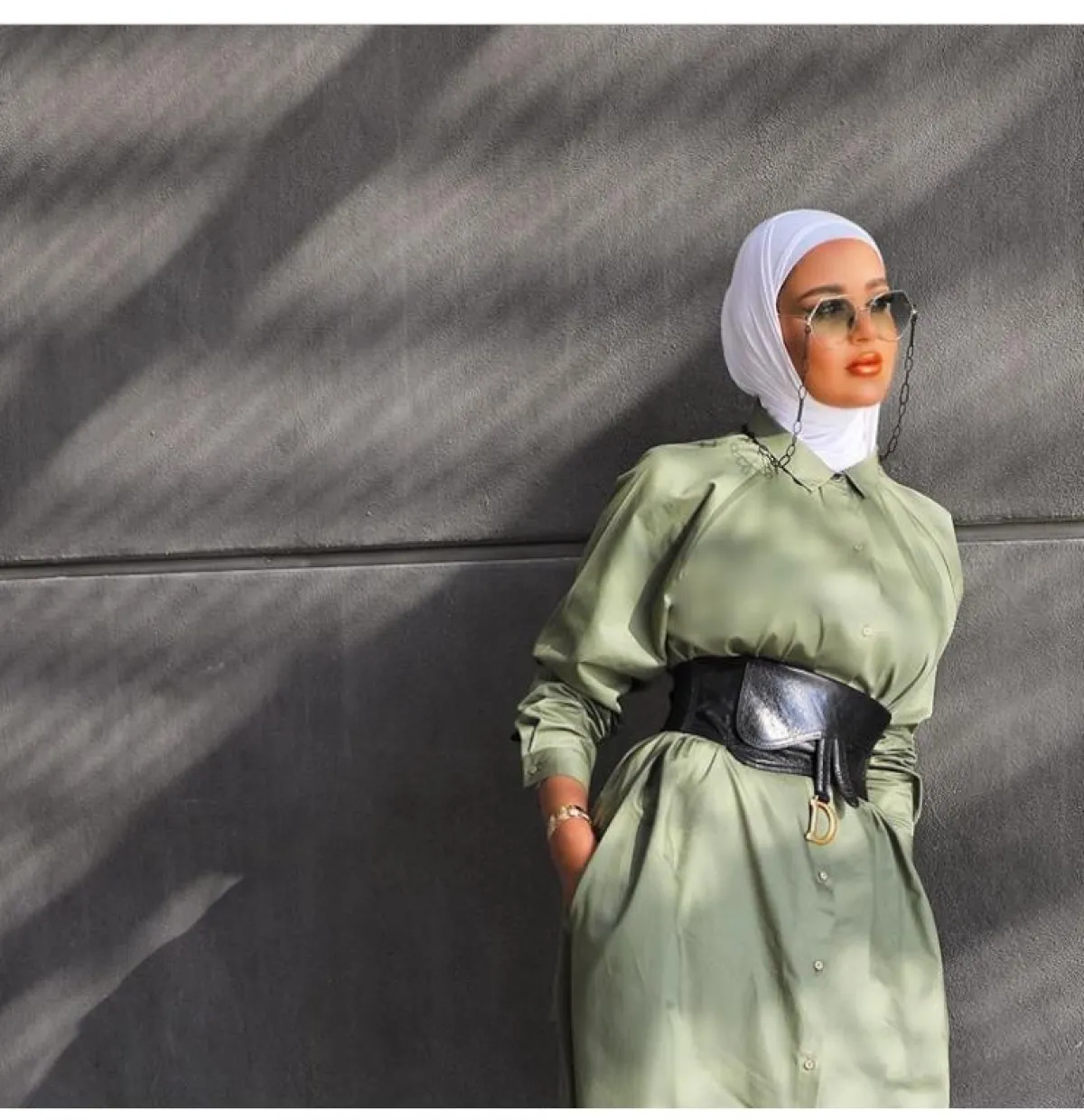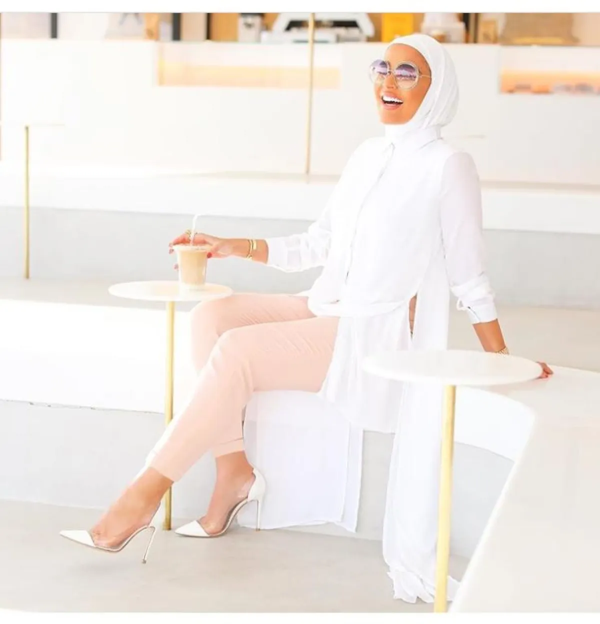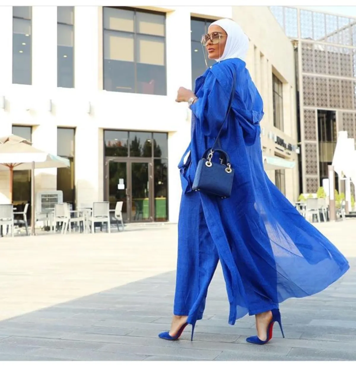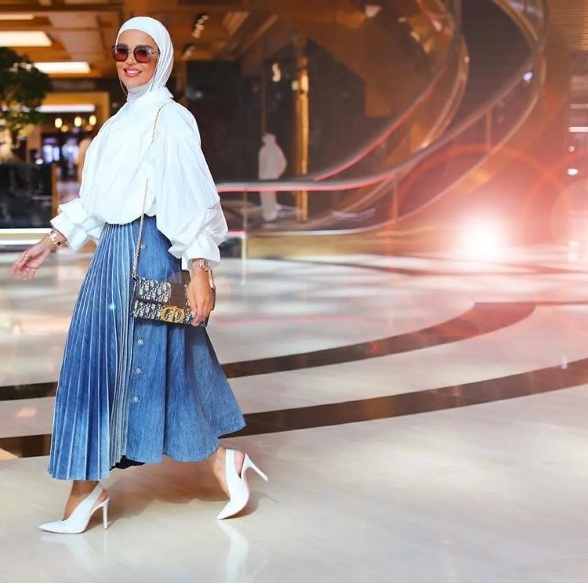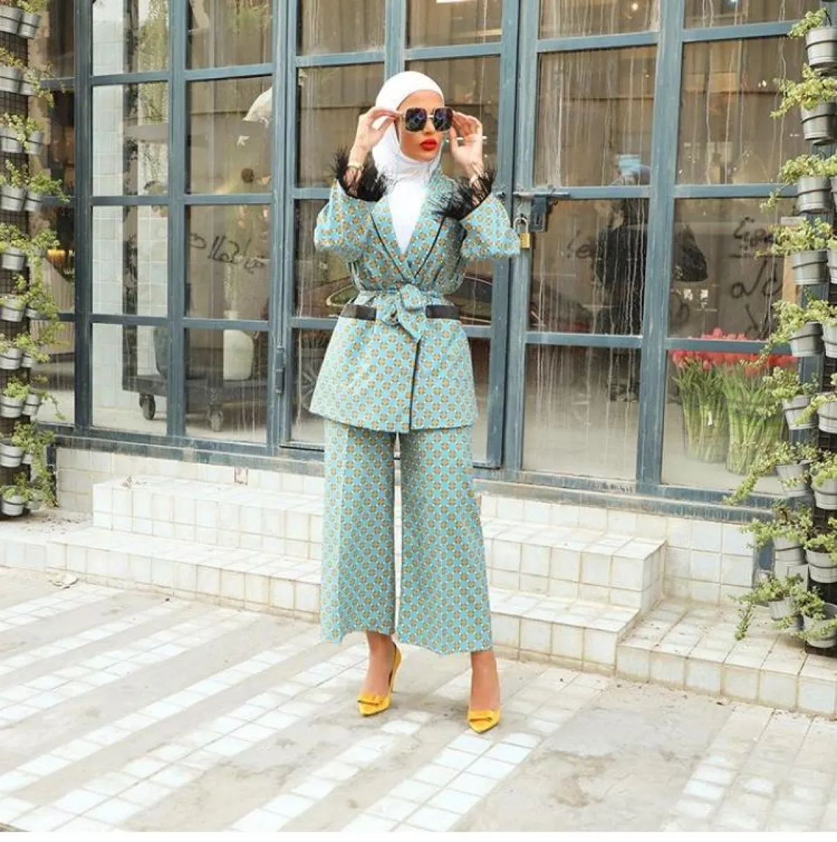 وما لفتنا هو اختيارها للحذاء الأصفر ليكتمل اللوك المترف والجريء، مع حجابها الأبيض ونظارة سوداء كبيرة الحجم.