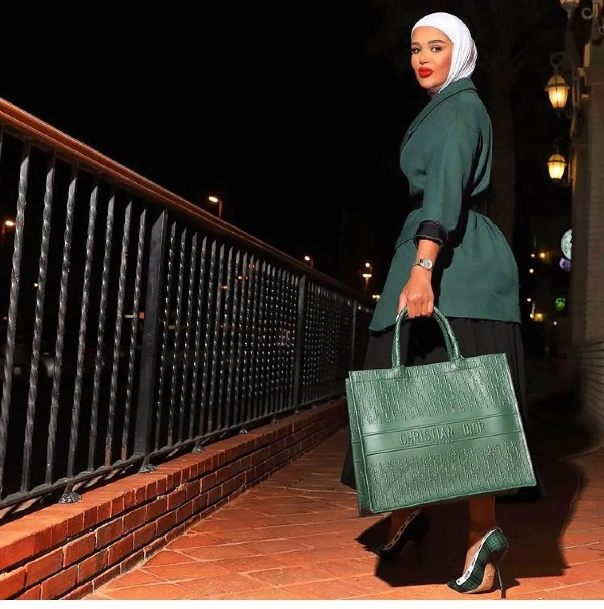 أما تنسيق الإطلالة مع الإكسسوارات فبدا غاية في الترف، بكعب عالٍ من جلود الثعبان، وشنطة ديور Dior كبيرة الحجم.
