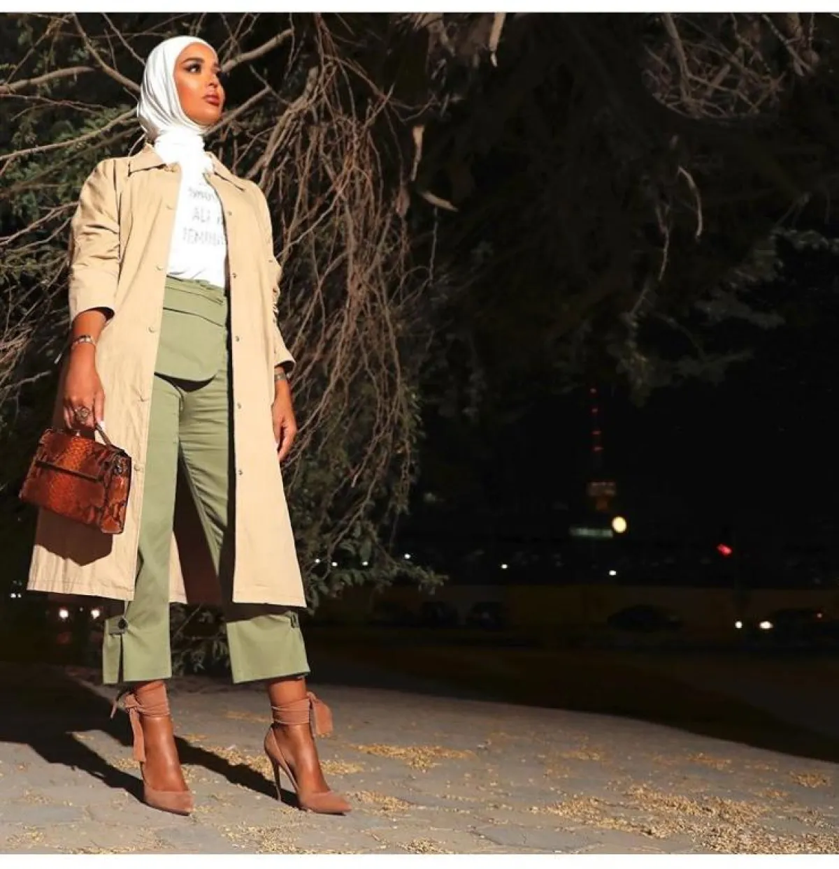 بإحدى إطلالاتها المميزة، اختارت مرمر محمد معطفا طويلا باللون الكريمي المائل للبيج، مع بنطلون أخضر باهت Off Green، نسقتهما مع تيشرت أبيض، وبالرغم من اللوك الكاجوال، إلا أن مرمر وضعت لمستها المميزة باختيار كعب غاية في الأنوثة برباط الكاحل باللون النود البيج، وشنطة بجلود الحيوانات كلاسيكية.
