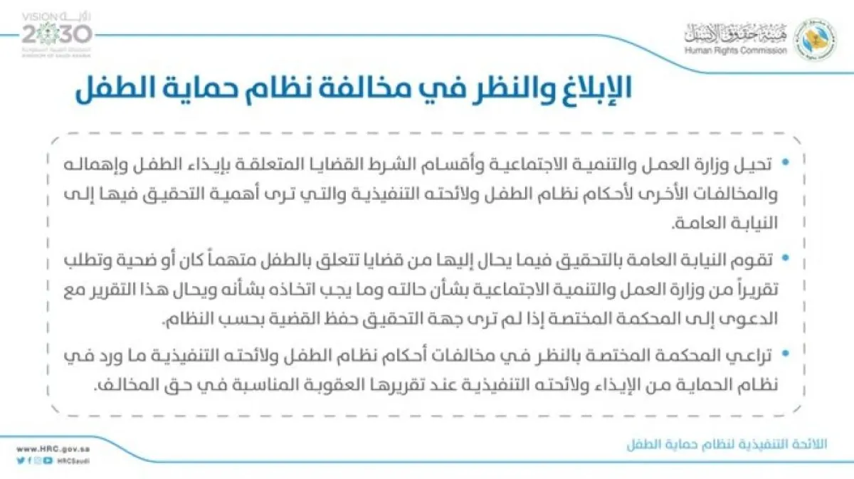 وقالت هيئة حقوق الإنسان، في تغريدة على «تويتر»، على كل من يطّلع على حالة إيذاء أو إهمال، تبليغ الجهات المختصة فورًا، وعلى الجهات المختصة أن تسهل إجراءات التبليغ عن حالات الإيذاء والإهمال، وبخاصة التبليغ الوارد من الطفل. ونشرت هيئة حقوق الإنسان "انفوجراف" أوضحت من خلاله، تُحيل وزارة العمل والتنمية الاجتماعية وأقسام الشرطة، القضايا المتعلقة بإيذاء الطفل وإهماله والمخالفات الأخرى لأحكام نظام الطفل ولائحته التنفيذية، التي ترى أهمية التحقيق فيها، إلى النيابة العامة.