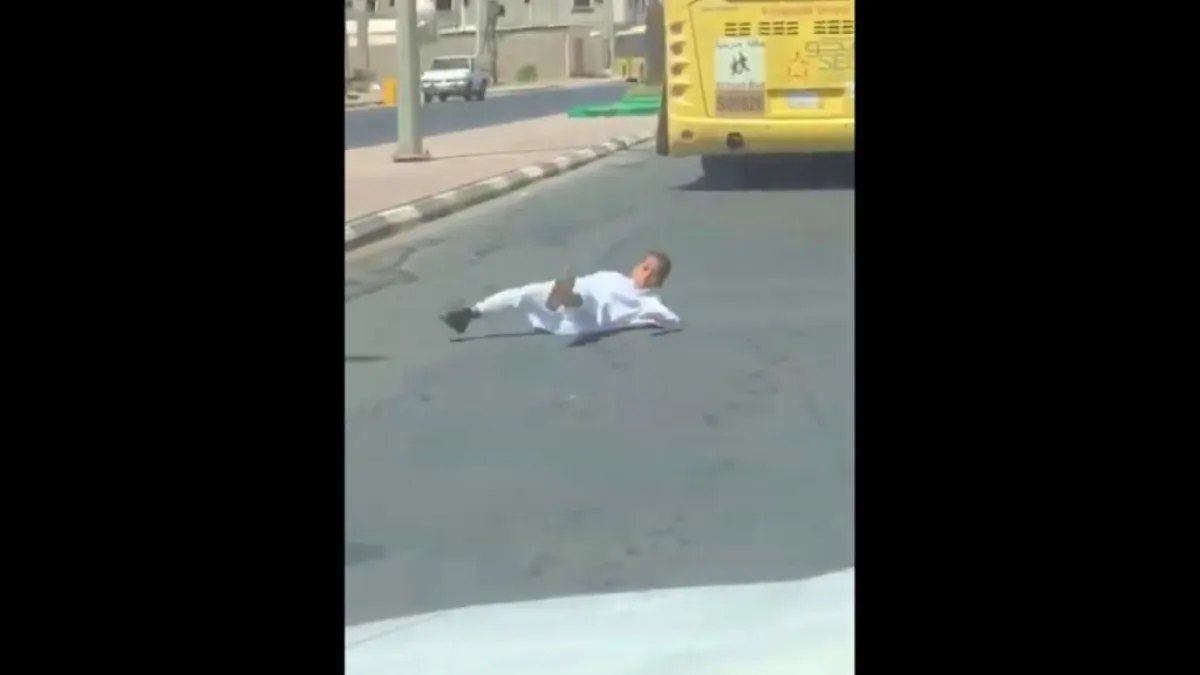 وظهر في الفيديو، الذي صوَّره أحد المواطنين، طالبٌ يتعلق بحافلة مدرسية، كانت تسير داخل أحد أحياء مركز بئر بن هرماس الواقع على بُعد 50 كيلومتراً من مدينة تبوك.