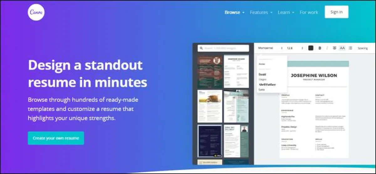 يُعرف Canva بأداة تصميم الرسوم التي يمكن للجميع استخدامها، وهو ما يعني إضافة عناصر أو أشكال أو صور مخصصة للسيرة الذاتية. كما إنه ليس للمبتدئين.