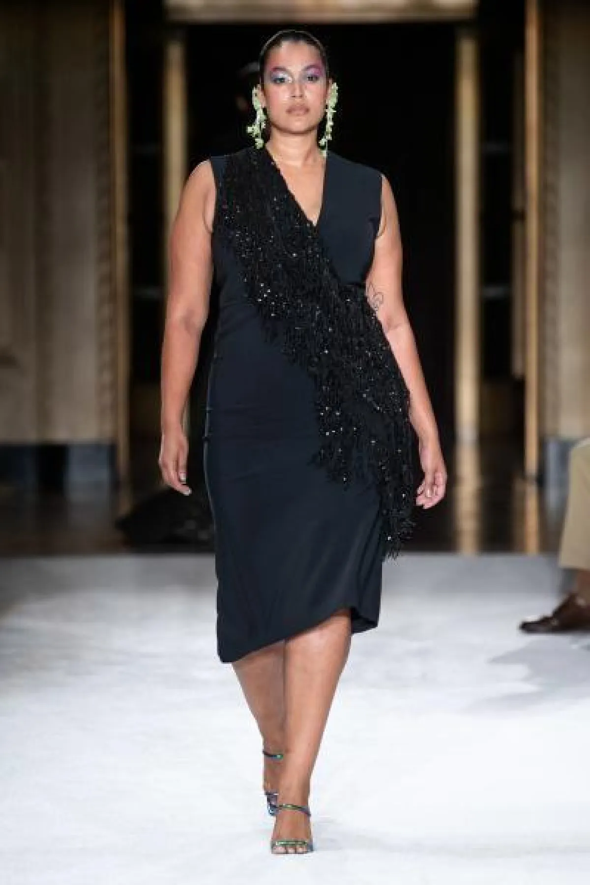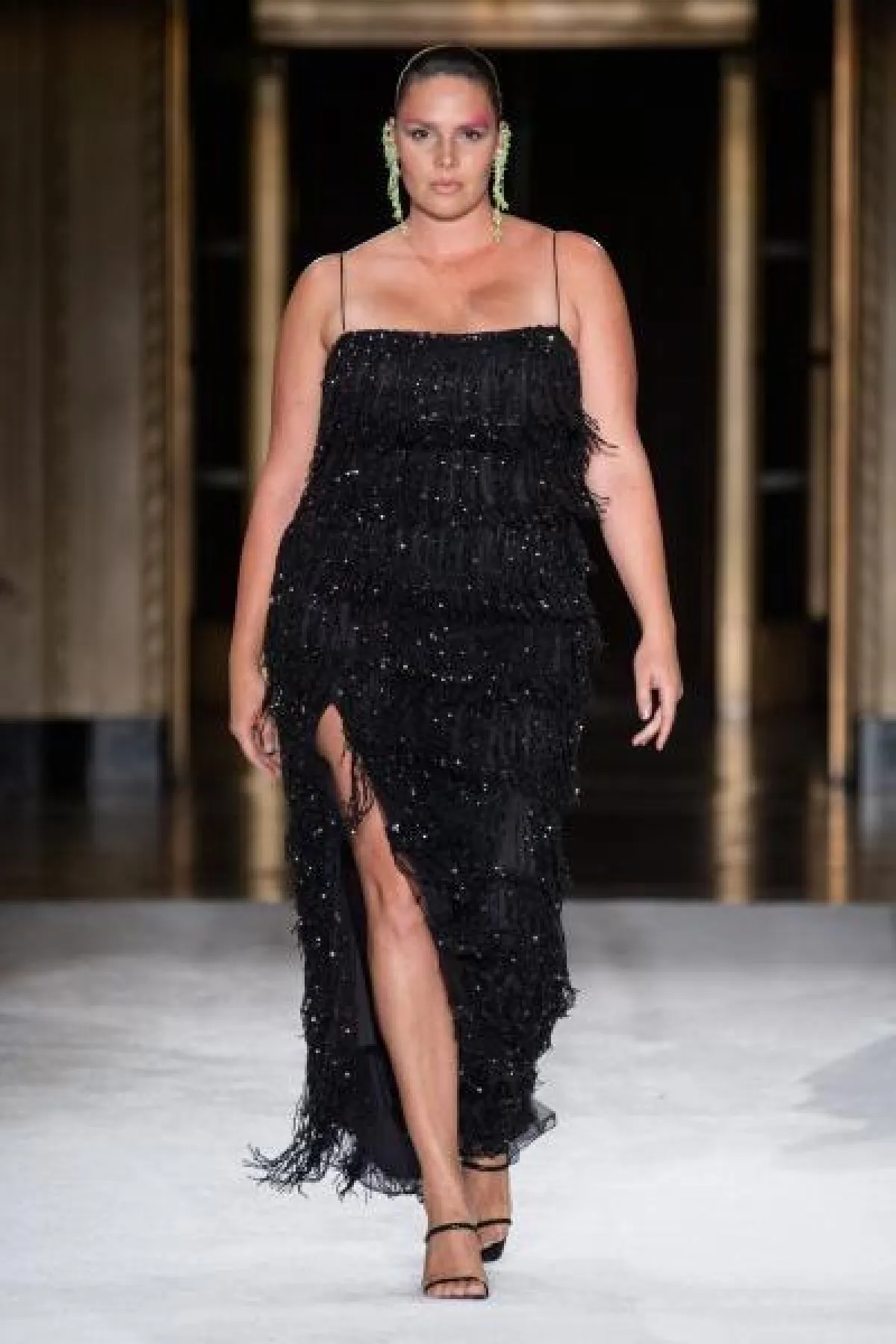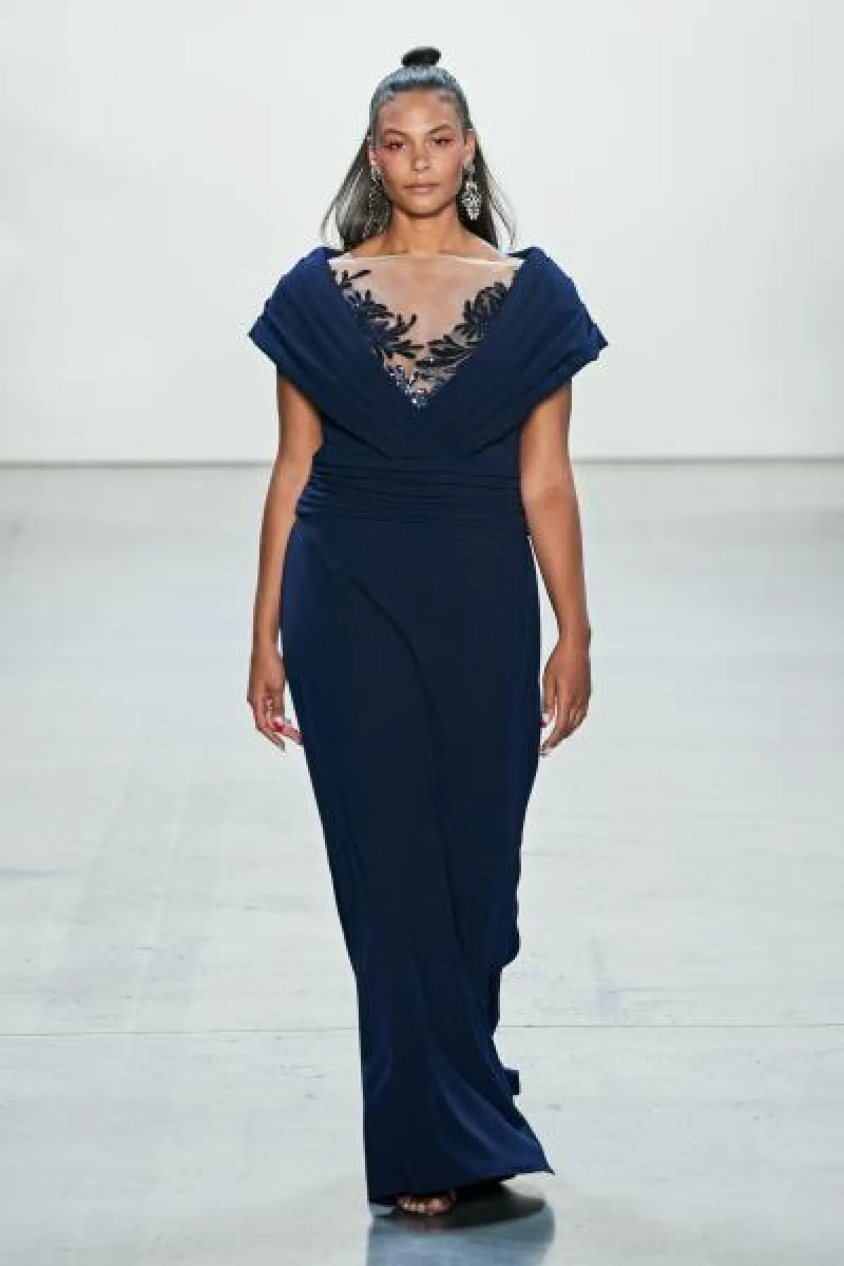- بخلاف فساتين السهرة المنفوشة التي تهادت بها عارضات تاداشي شوجي Tadashi Shoji أحببنا التصاميم المعانقة للقوام من توقيع كريستيان سيريانو Christian Siriano والتي توحي بأن من ترتديها تملك قامة أكثر طولًا وبالتالي أكثر نحافة.
