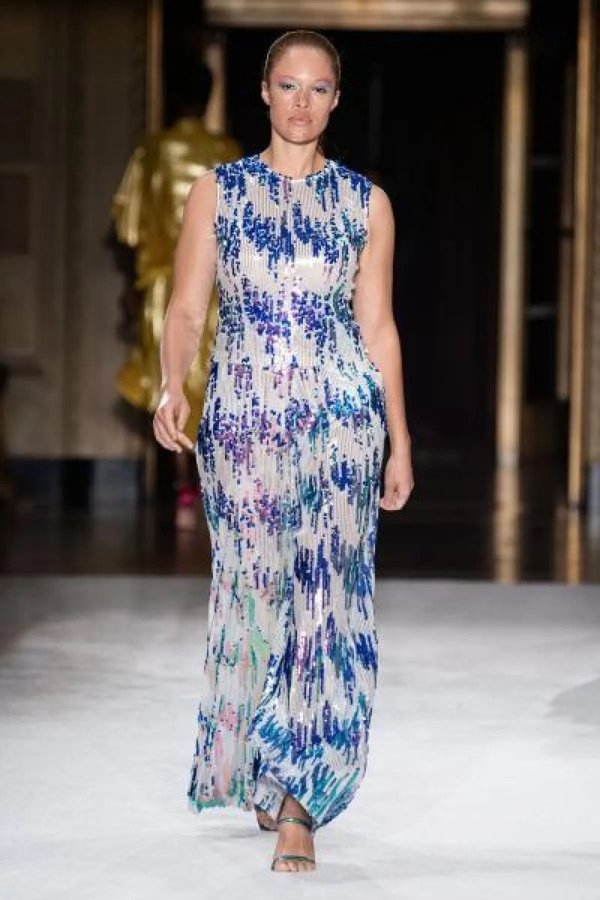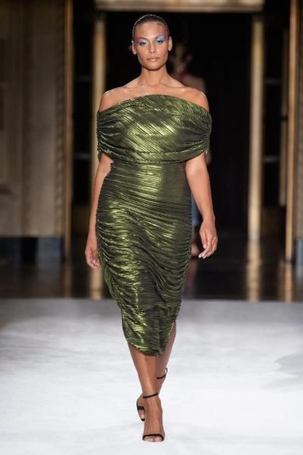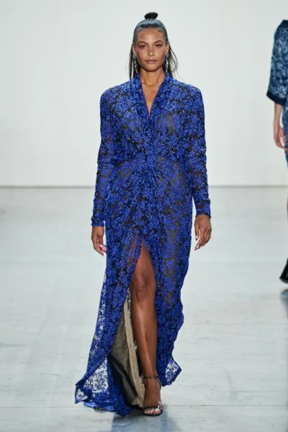 - بخلاف فساتين السهرة المنفوشة التي تهادت بها عارضات تاداشي شوجي Tadashi Shoji أحببنا التصاميم المعانقة للقوام من توقيع كريستيان سيريانو Christian Siriano والتي توحي بأن من ترتديها تملك قامة أكثر طولًا وبالتالي أكثر نحافة.