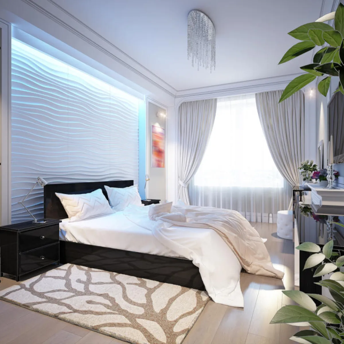 • يمكن تصميم كامل الجدار من الجبس بورد، وخلفه إنارة مخفيَّة، ليكرَّر التصميم في ديكور السقف.