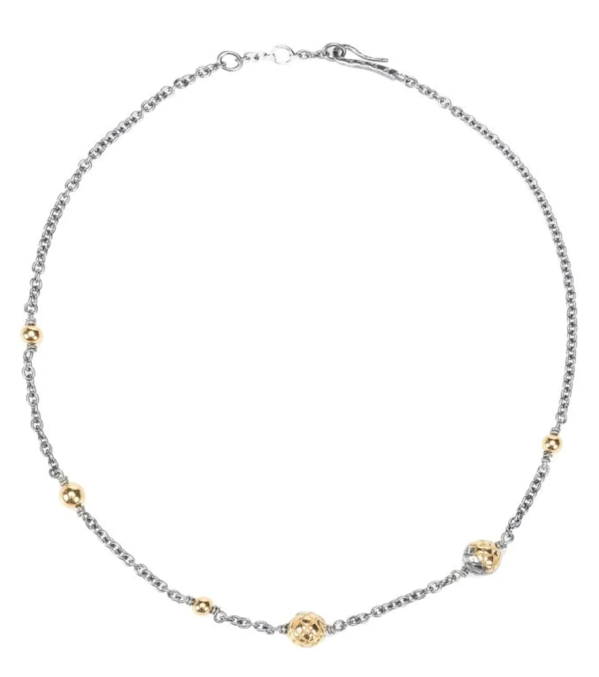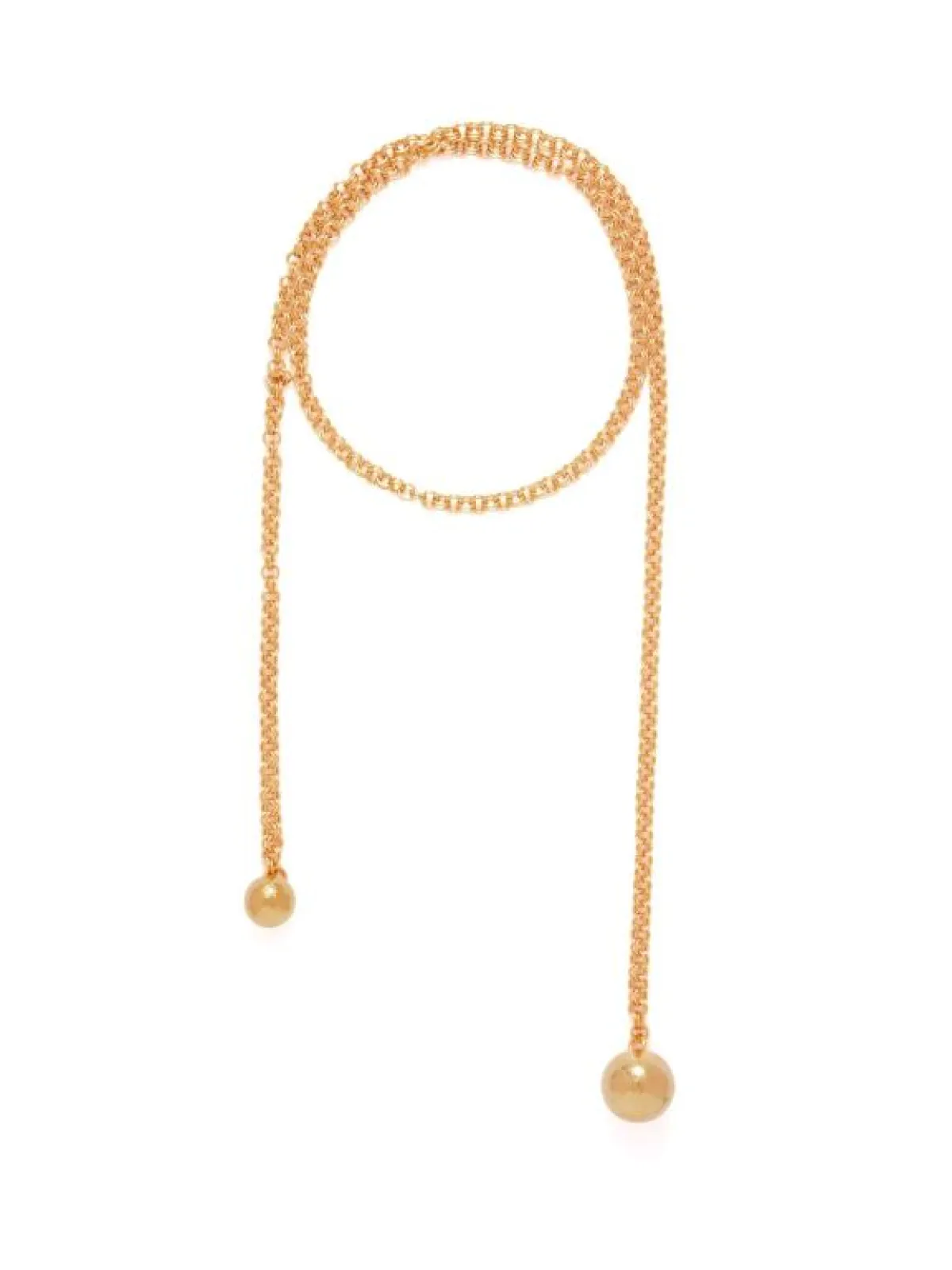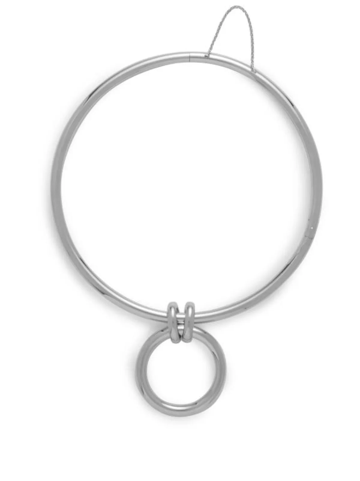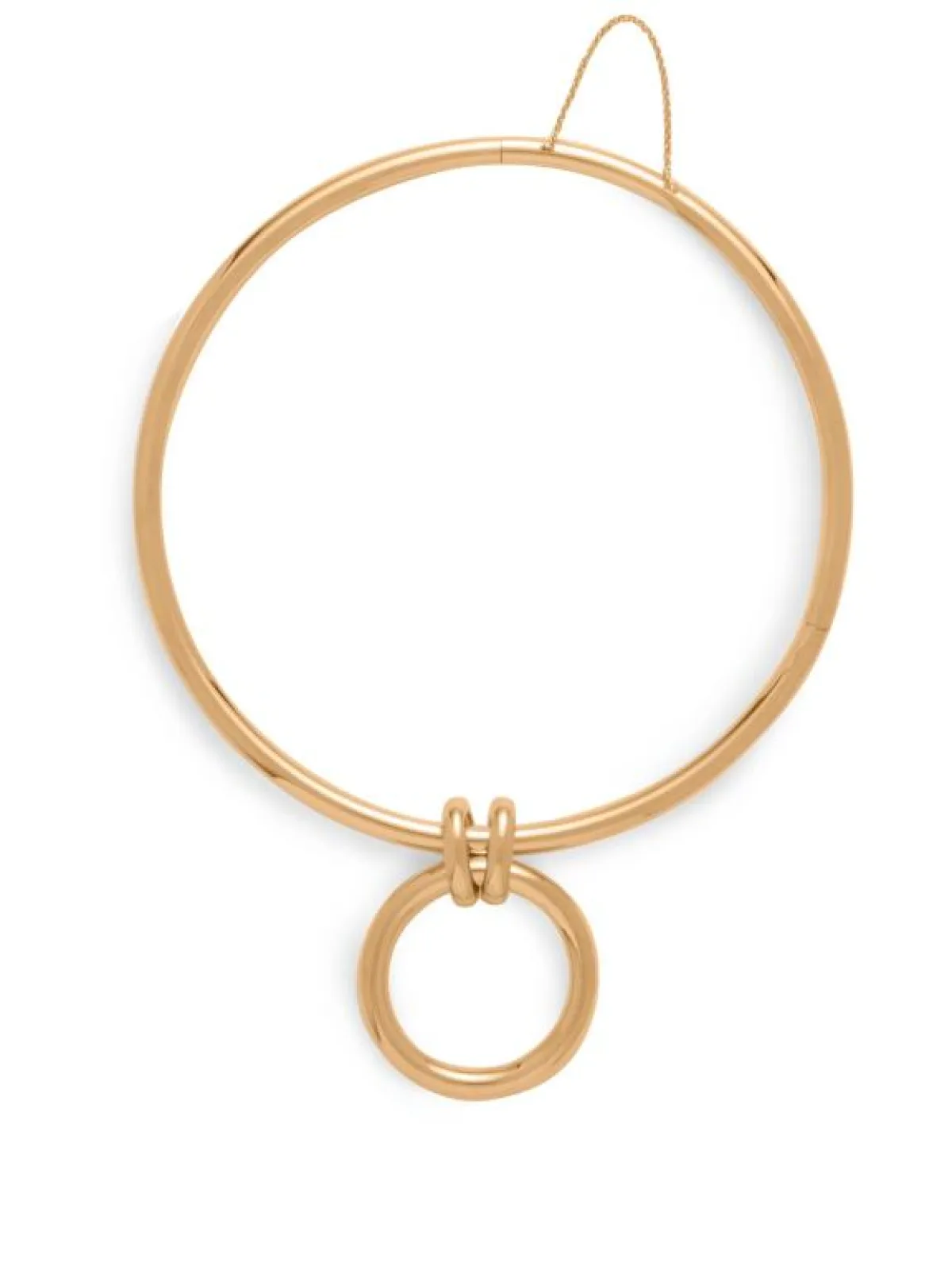 تتميز هذه القلادة من بوتيغا فينيتا bottega veneta بتصميمها الغريب والملفت للنظر. فقد جاءت على شكل حلقة دائرية كبيرة الحجم باللون الذهبي، تداخل فيها حلقة أصغر، وارتبطت كلا الحلقتين أيضاً بحلقات دائرية صغيرة الحجم.