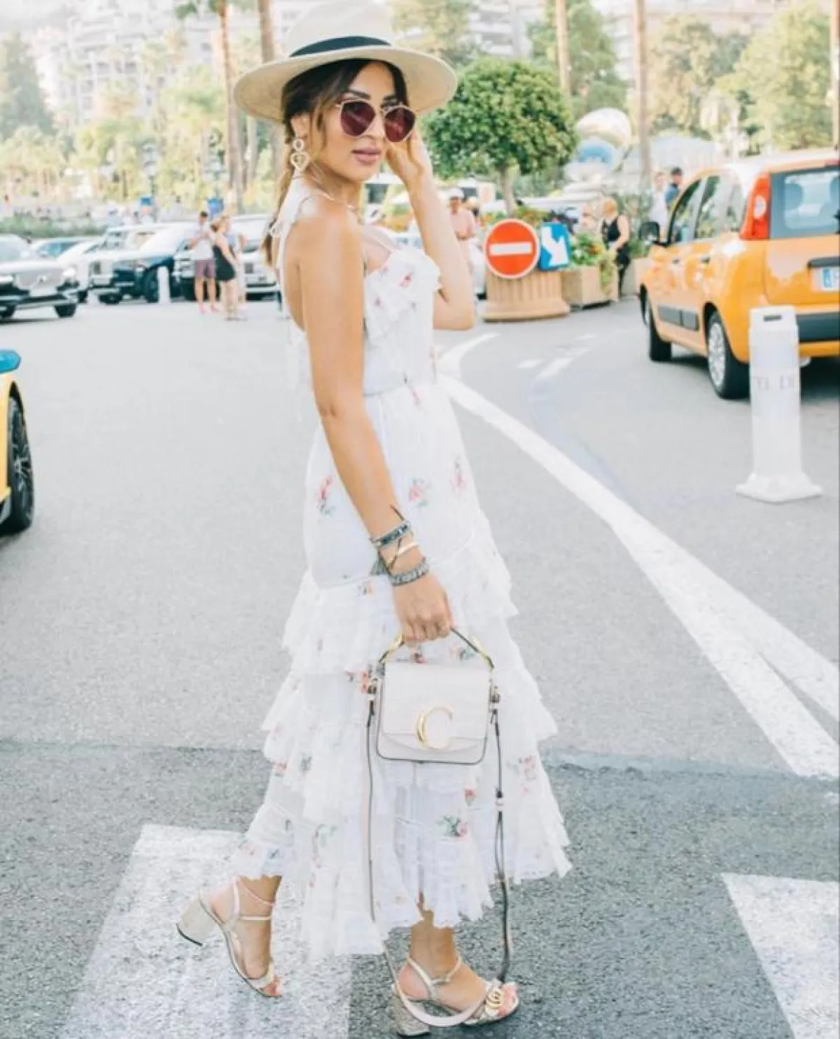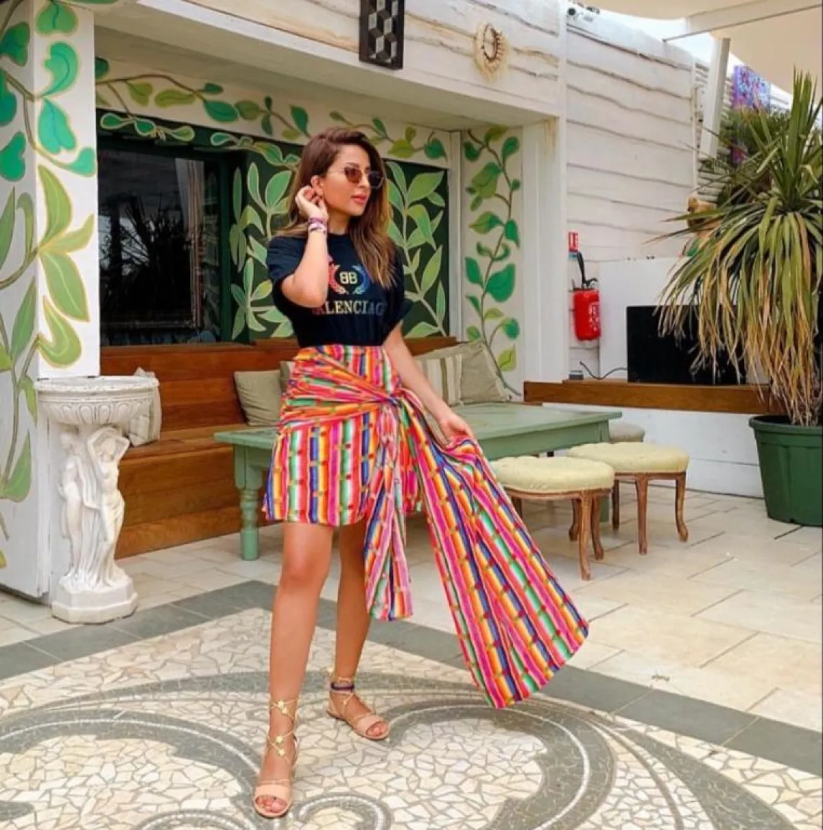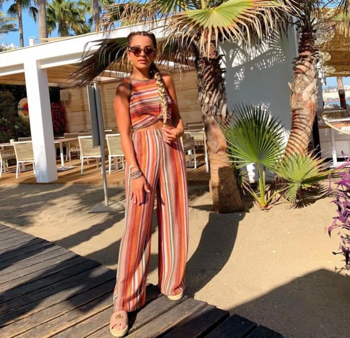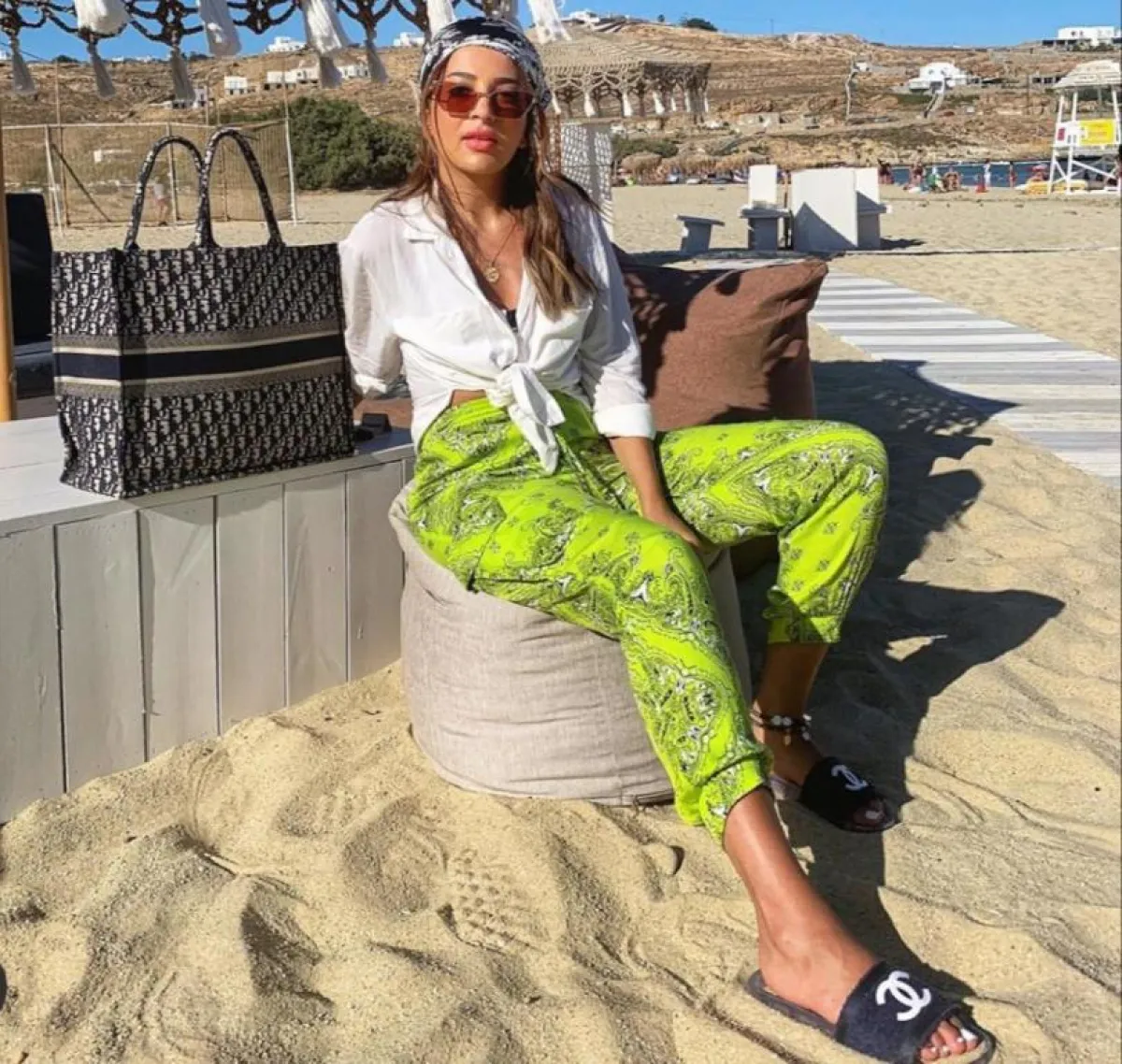 وتألقت ببنطال أخضر بنقوش باللونين الأبيض والأسود وقميص خفيف أبيض، وظهرت بفستان أبيض بطبقات عدة، مُزيَّن بزهور وقبعة قش لاطلالة بحرية مميزة، وأطلت ببنطال طويل وبلوزة قصيرة بالأبيض، وبتدرجات اللون الأحمر والزيتي والبرتقالي، كما اختارت فستانًا أبيضَ قصيرًا بأكمام طويلة وربطة خصر، مزيَّنًا بأقمشة عدة باللون الزهري والبرتقالي والأحمر والأخضر بطريقة مميزة وشبابية.