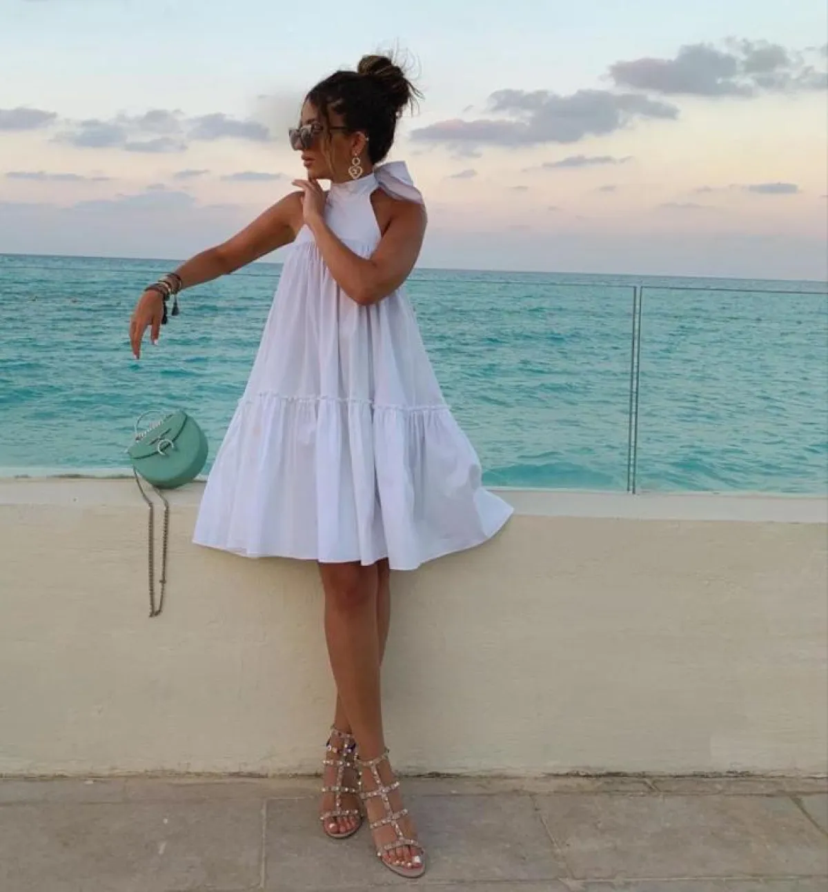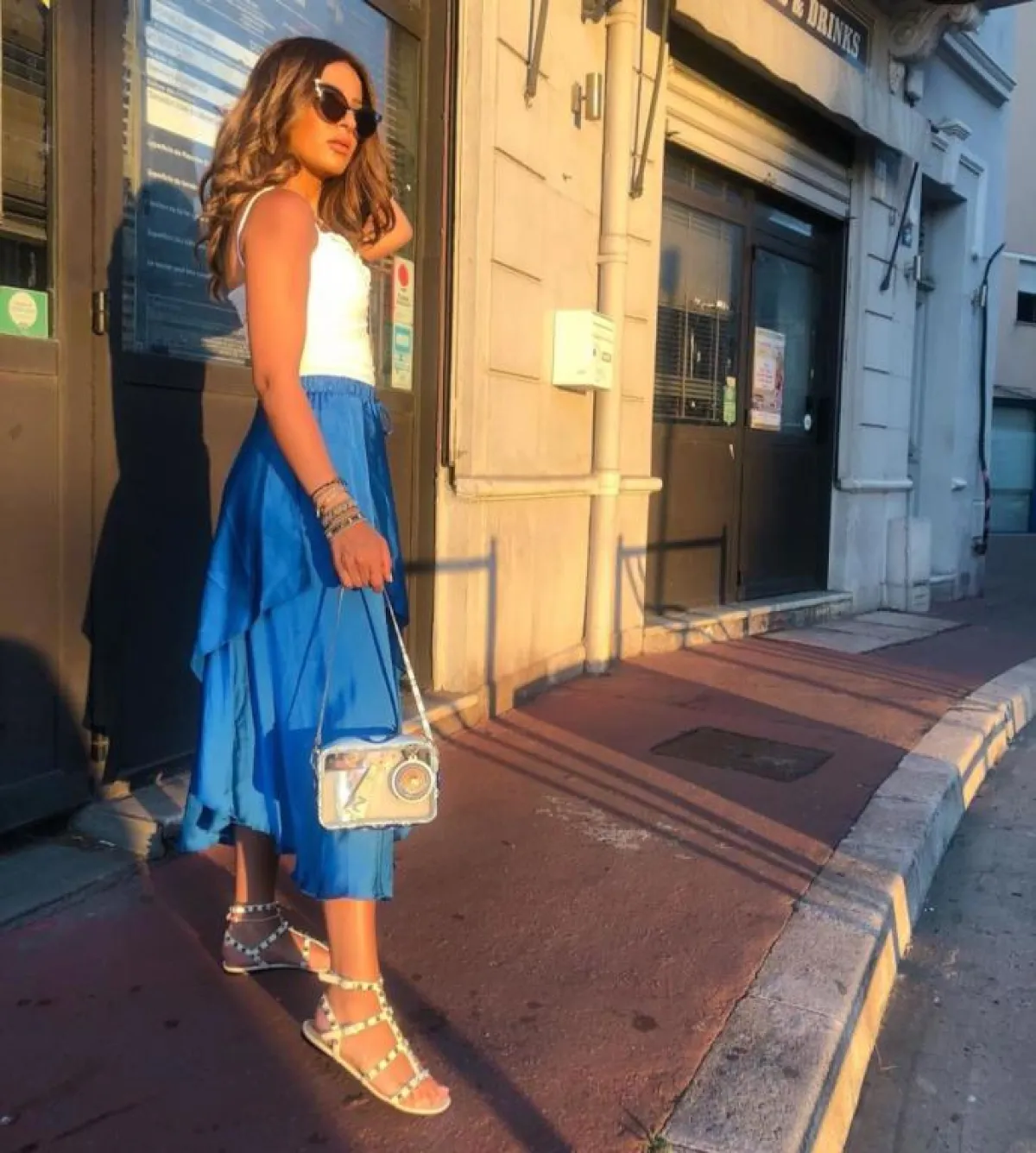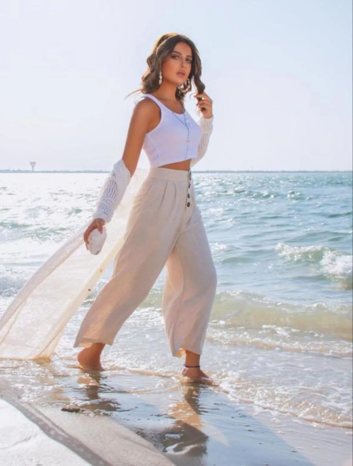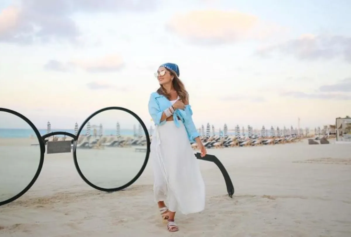 وأطلت بـ فستان صيفي باللون الأبيض بتصميم قصير وواسع، واختارت بنطالًا باللون البيج بأزرار وبلوزة بيضاء قصيرة وسترة مفرغة، وتجملت بتنورة بيضاء واسعة وطويلة، وبلوزة بيضاء قصيرة زينتهما بقميص جينز وقبعة خفيفة مناسبة للبحر، واختارت تنورة طبقات وبلوزة زينتهما نقوش عدة بتدرجات اللونين الأزرق والأخضر، ونسقت تنورة بيضاء بطبقات مزينة بزهور زرقاء وخطوط سوداء مع بلوزة بيضاء وربطة شعر حمراء.