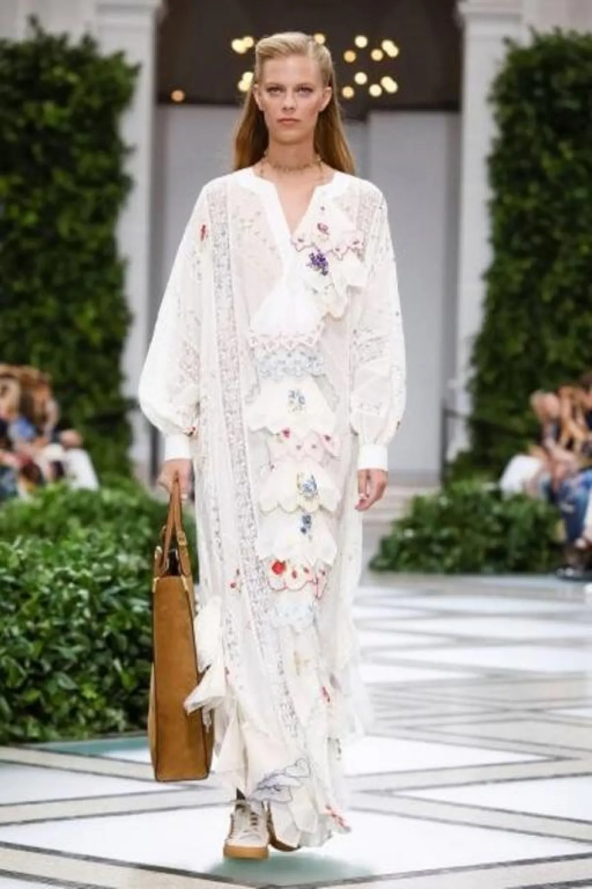 - لا تخلو مجموعات ماركة توري بورش Tory Burch من الجلابيات الفضفاضة فتحرص على تقديمها بموديلات ناعمة في كل موسم، وهذا العام أحببنا التصاميم البيضاء المحبوكه بالدانتيل والقصاصات الناعمة والتي تميزت بصيحة الأكمام المنفوخة المزمومة حول المعصم.