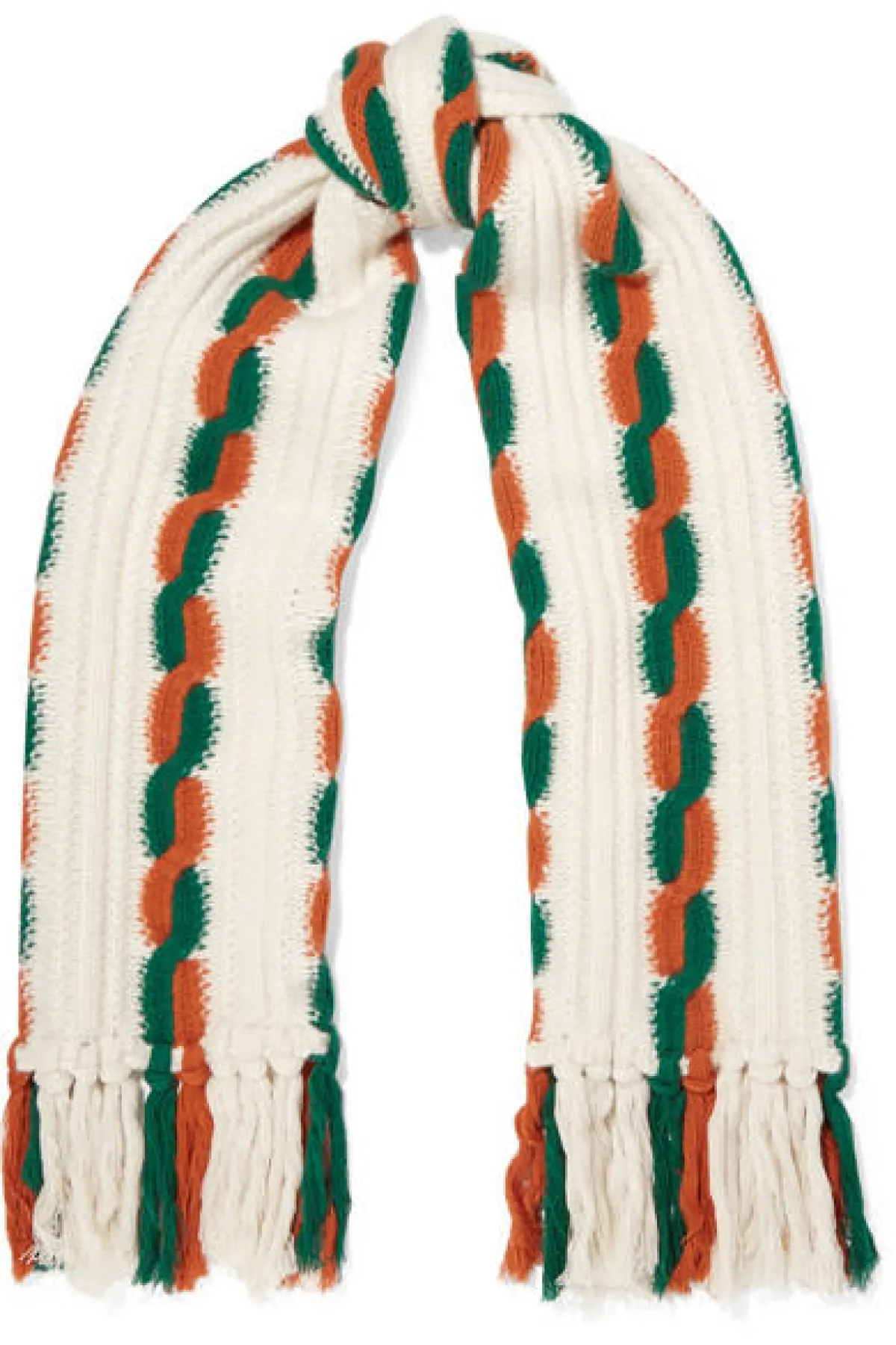 اللون الأبيض الناصع الذي تزين باللونين الأخضر والبرتقالي، وقماش الصوف الناعم الذي صُنع منه هذا السكارف سيجعلانه خيارك الأول والأجمل في إطلالتك المدرسية.