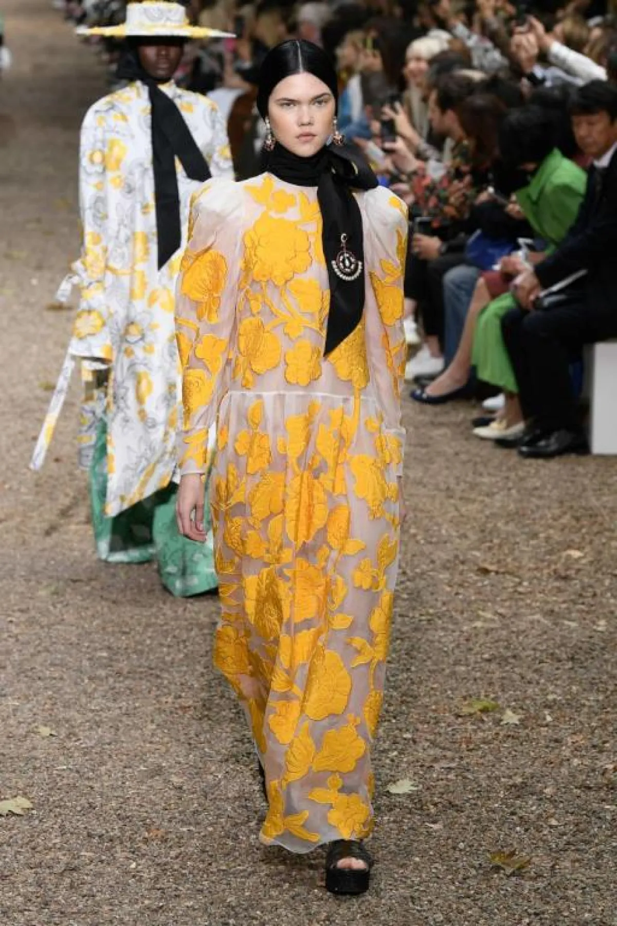 شاهدنا فساتين باللون الأصفر المنعش مطبع بالورود وجاءت خامة الفستان شفافة، مع بطانة، لهذا كانت هي التصميمات الأكثر لفتًا للانتباه بالنسبة لمدى ملاءمتها للصبايا المحجبات.