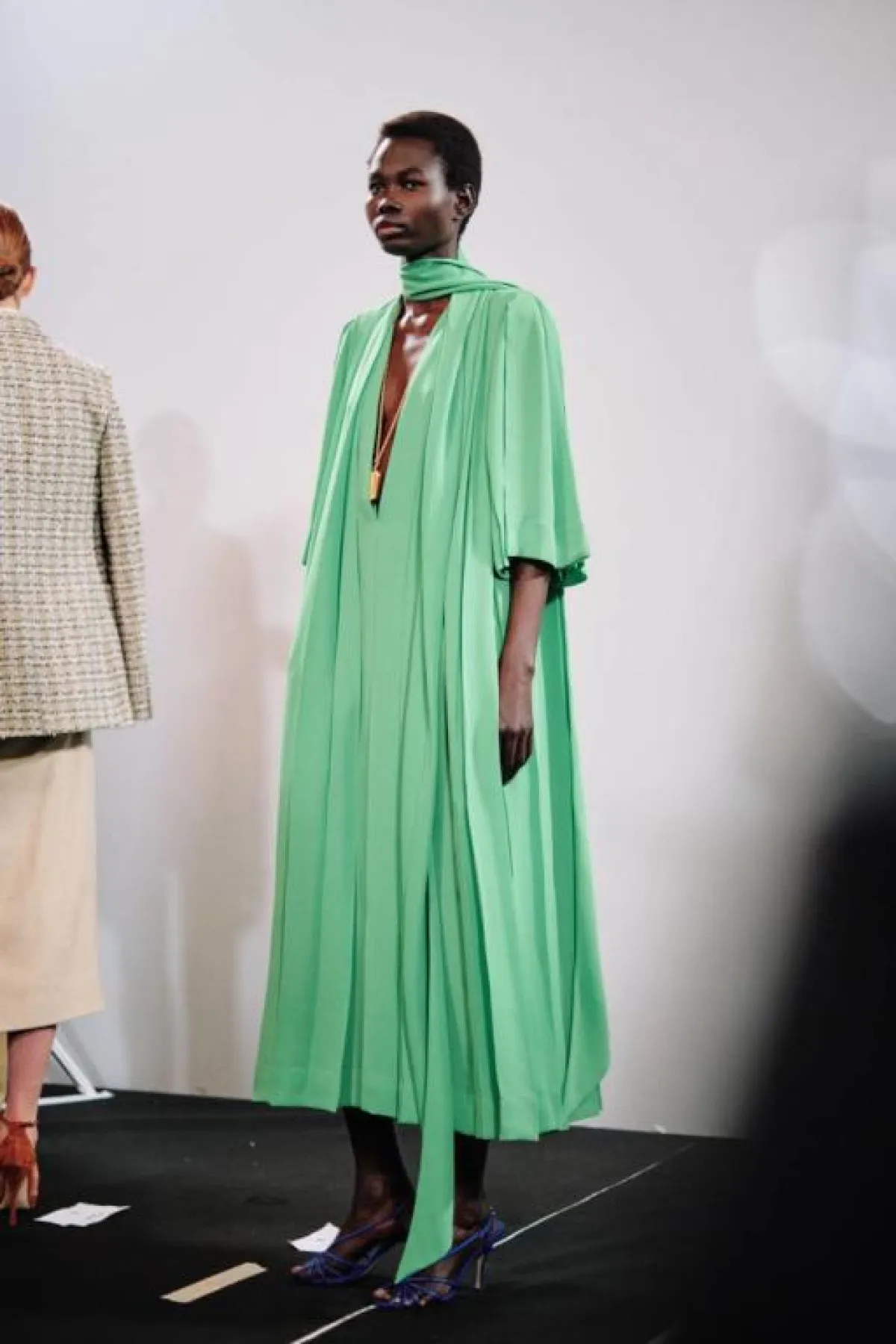 في المقابل عبّرت فيكتوريا بيكهام عن الفساتين الربيعية للموسم القادم بطريقة أكثر بساطة، لكنها لا تخلو من الإبداع في إتقان تصميم الفستان بالرغم من قصته الواسعة، لكن مع الخامة البليسيه المكسرة والألوان الفاقعة، سوف تبدين مرتاحة وجذابة أيضًا.