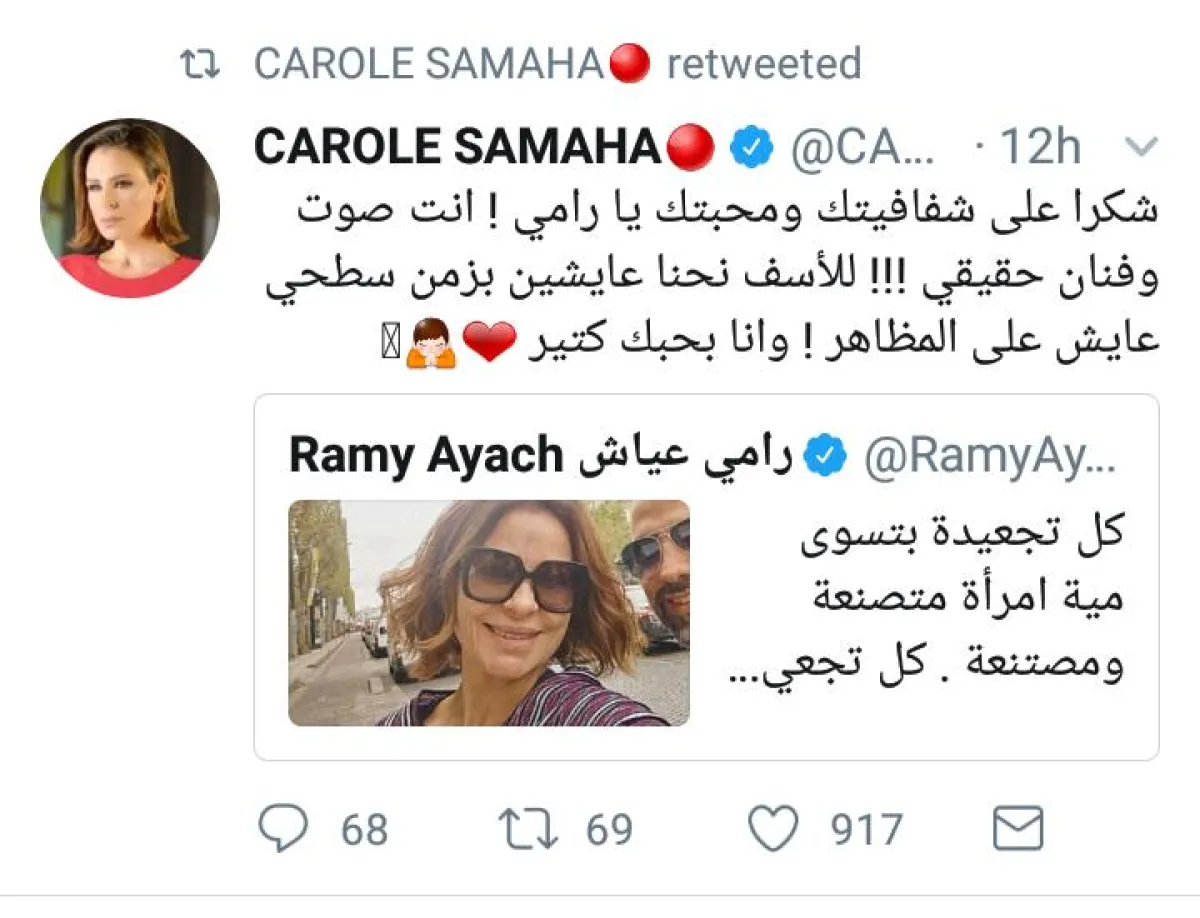تعرّضت الفنانة كارول سماحة لإنتقادات عبر السوشال ميديا بعد نشرها صورة مع مدير أعمالها في باريس قبيل حفلها الذي أحيته الليلة الماضية، حيث ظهرت في الصورة دون استخدام تقنية الفلتر او الفوتوشوب، فبدت بعض التجاعيد في وجهها.