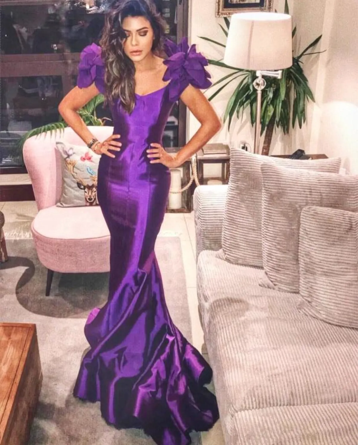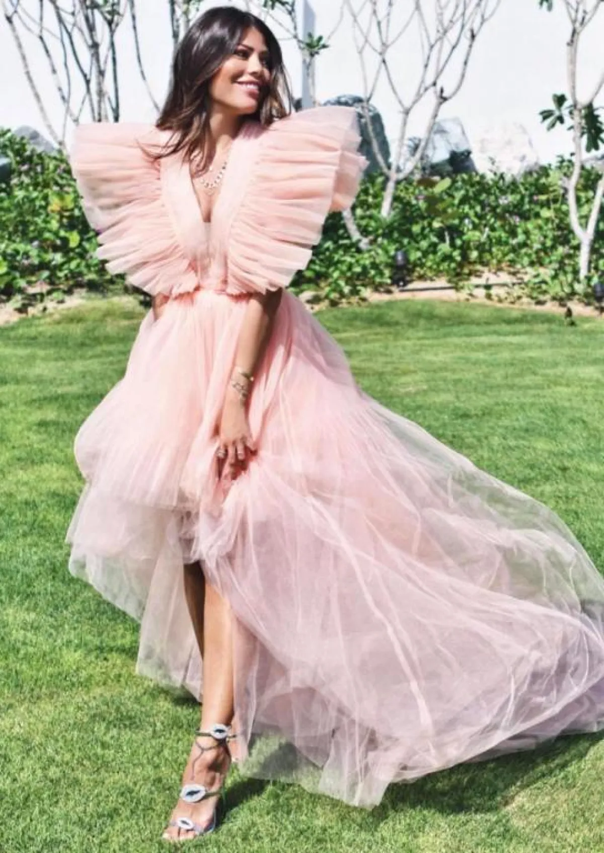 وأطلت بفستان أصفر مكشوف الصدر والأكتاف يُجمله وشاح بطبقات من اللون نفسه، وارتدت فستانًا زهريًا بأكمام واسعة مرفوعة يزينه الريش، وآخر زهريًا قصيرًا مصممًا بذيل وكشكشة في الأكتاف، وتميزت أيضًا بفستان أصفر يزينه حزام على الخصر وفتحة جانبية.