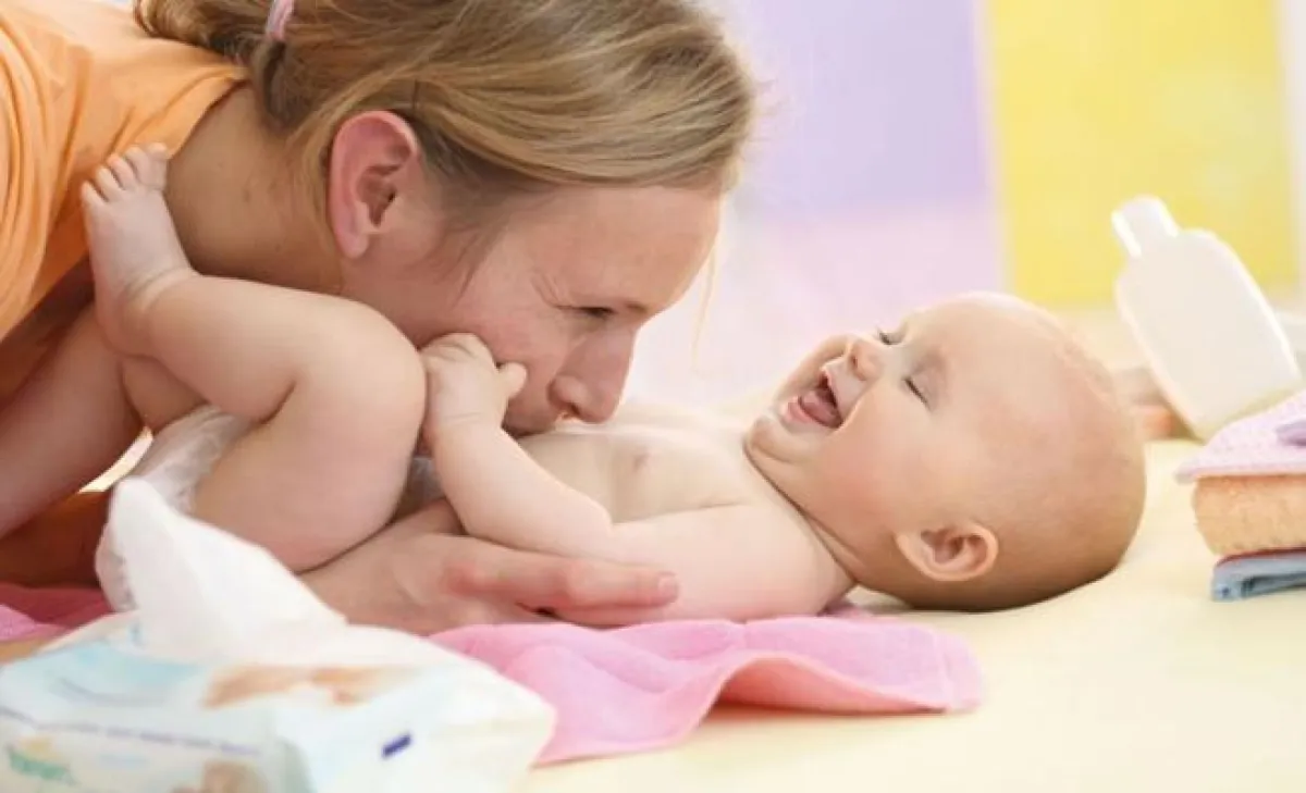 نزع الحفاظة للبدء بتنظيف الجزء السفلي؛ حيث يتمّ تنظيف الإناث من الأمام إلى الخلف دون الحاجة لمسح أيّ إفرازات مهبلية بالكامل إن وجدت، أمّا الذكور ففي حال الختان يفضل عدم غسل رأس القضيب حتّى يلتئم. تجفيف الطفل وتجنب فرك الجلد بقوة كي لا يتهيج. إلباس الطفل الحفاظ النظيف والملابس.