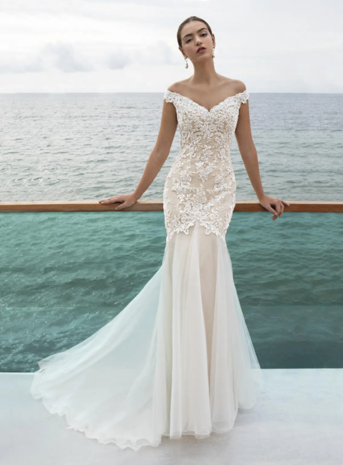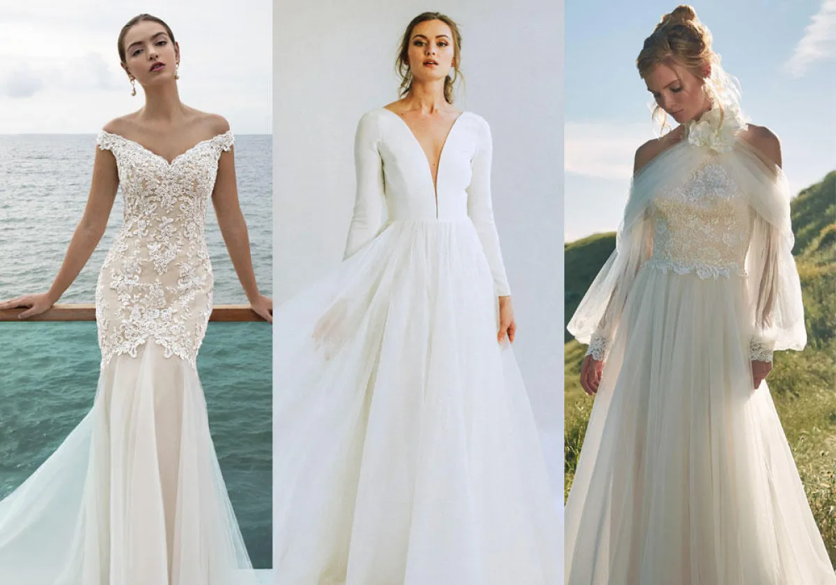 الفستان الأول بقصّة أوف شولدر وتنورة ذيل السمكة، والفستان الثاني بقبّة القلب وتنورة A Line بشق أمامي طويل.