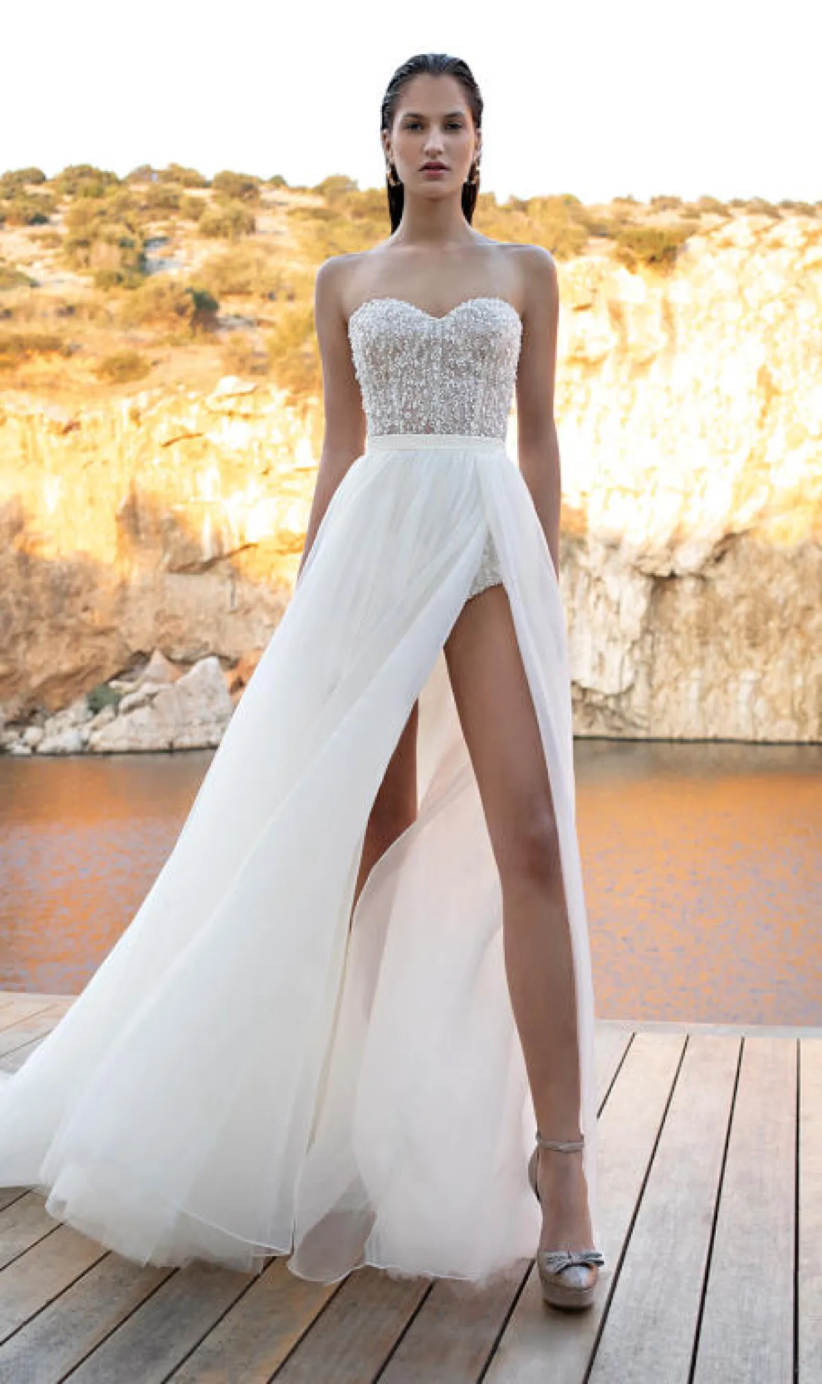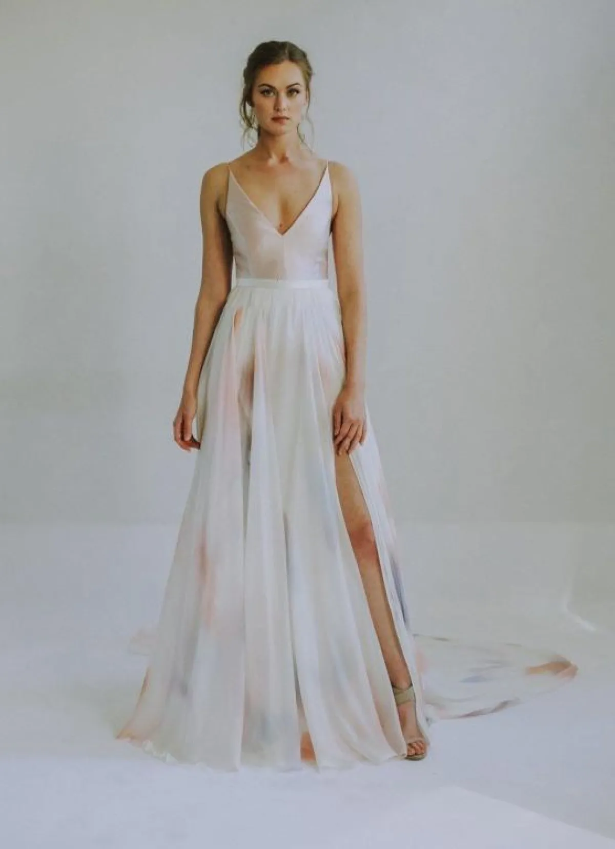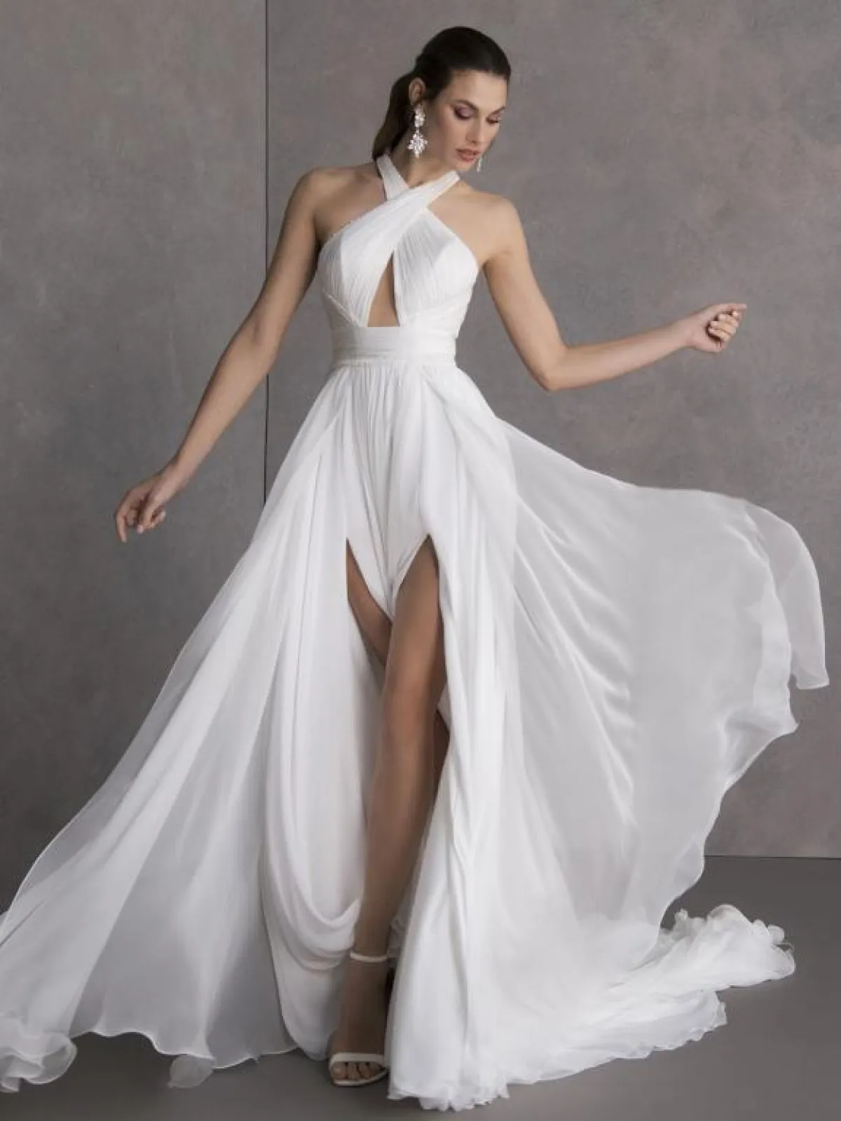 أيضاً قدمت ماركة Valentini Spose فستان زفاف يجمع بين البساطة والنعومة بقماش الشيفون وبقبّة Cross ومزود بشقوق أمامية طويلة.