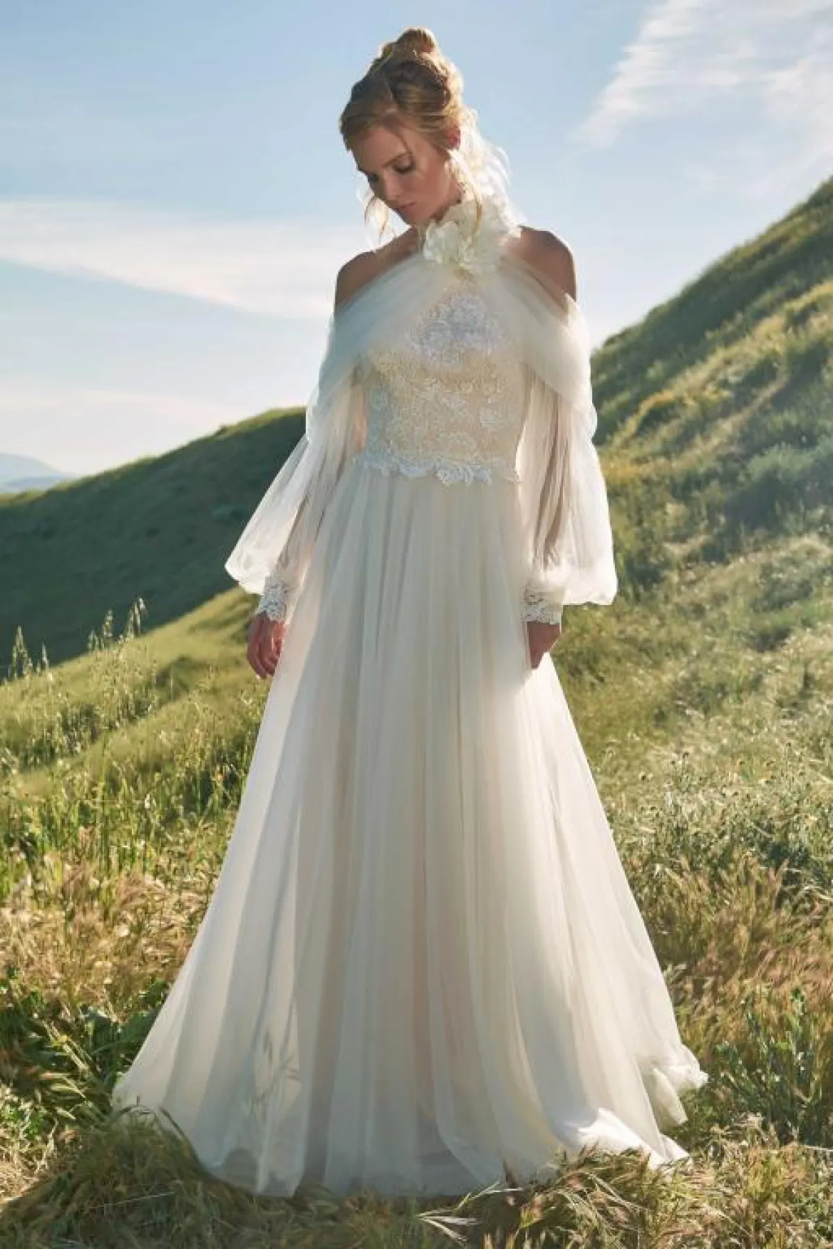 قدمت ماركة Costarellos فستان زفاف شيفون بتصميم بسيط وعصري وبأكمام طويلة ذات شق جانبي يكشف الذراع.