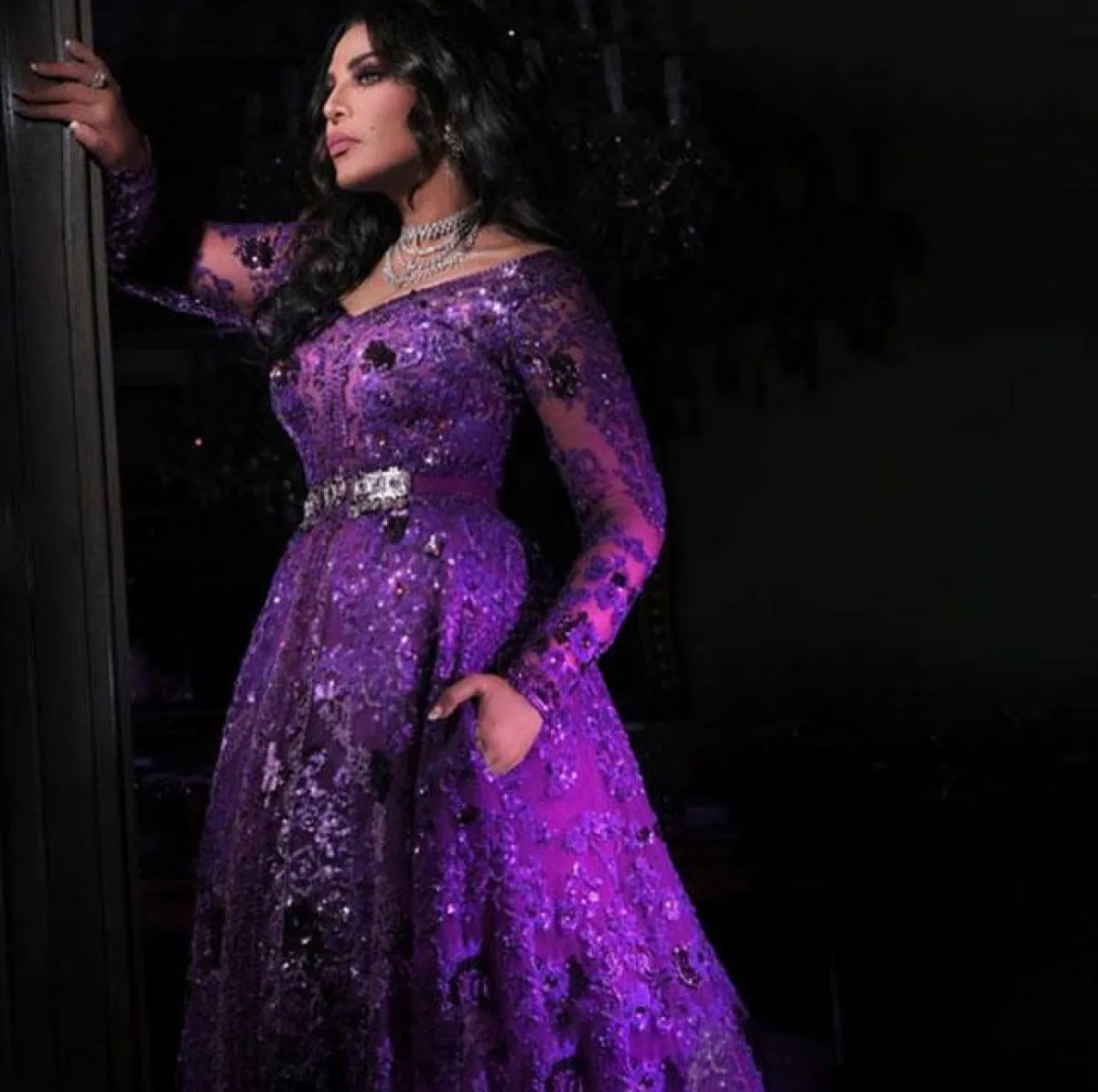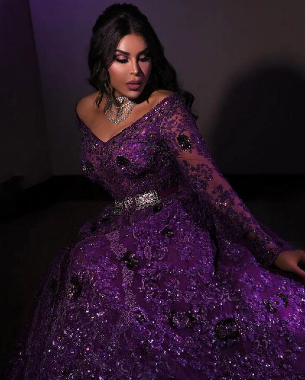 أيضاً اعتمدت أحلام فستان أرجواني فخم ومرصع بتطريزات برّاقة بأكمام طويلة وقبّة V ومزين بحزام حول الخصر.