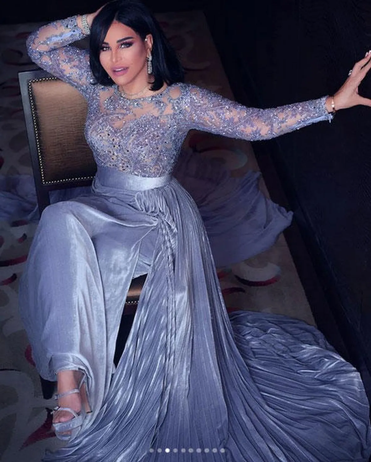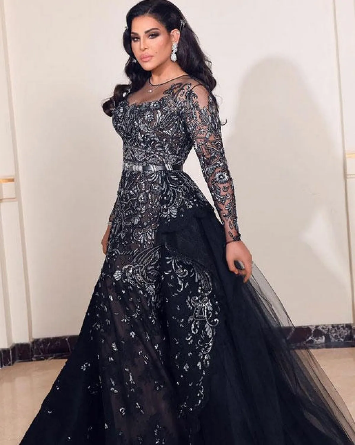 وبقماش المخمل، ظهرت أحلام بفستان رمادي فاتح بتنورة إضافية بثنيات وطيّات ومرصع بتطريزات برّاقة على الصدر والأكمام.