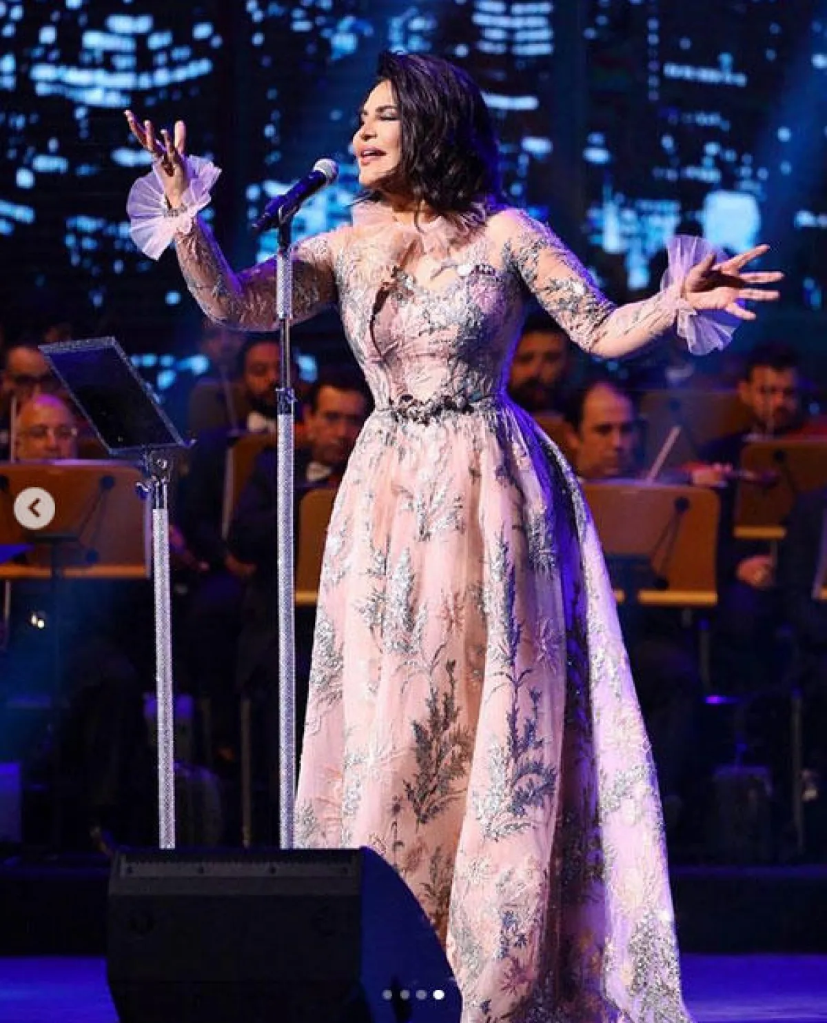 ولإطلالة مفعمة بالأنوثة، اعتمدي فستان خطوبة وردي مثل التصميم المنفوش والمطرز الذي ارتدته أحلام في إحدى الحفلات، بأكمام الجرس وكشاكش القبّة.