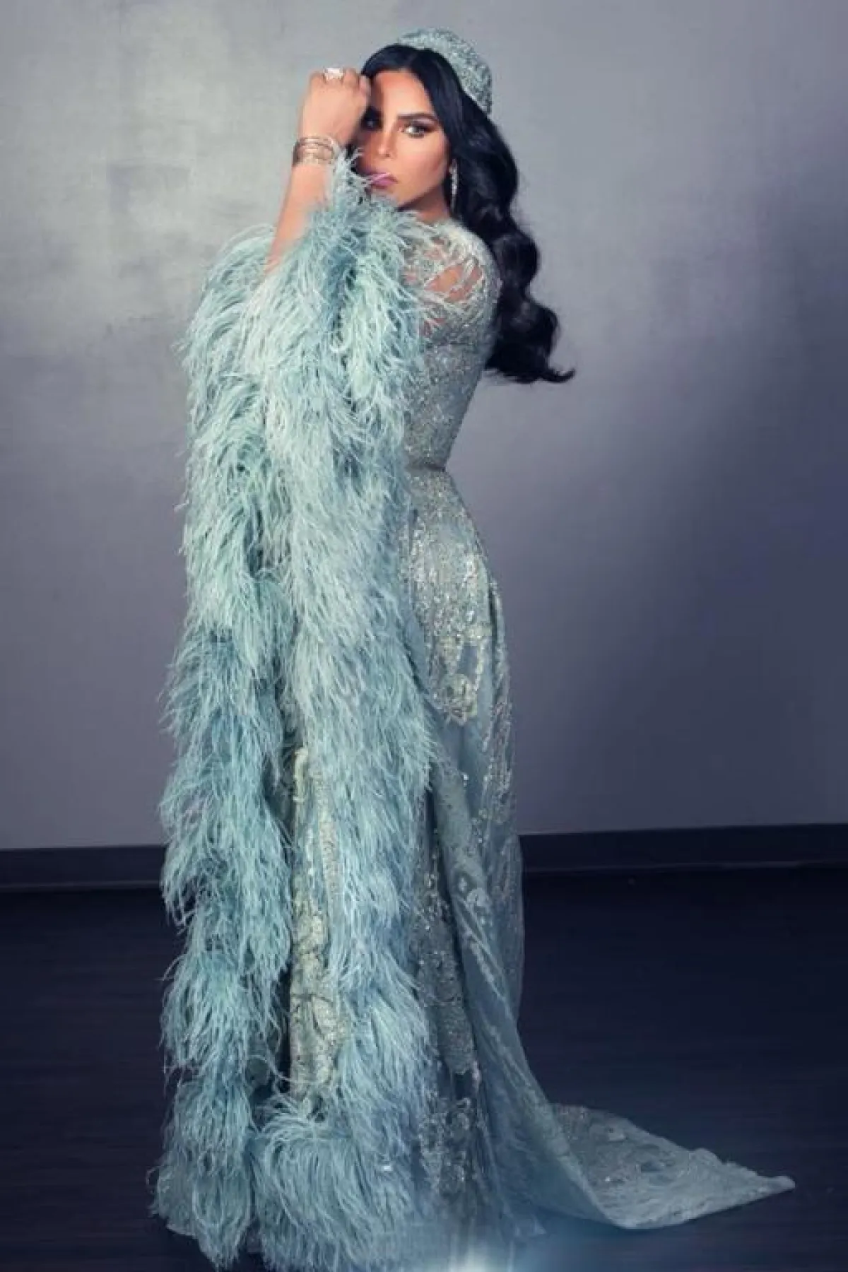 أيضاً إرتدت أحلام فستان أزرق فاتح بقصّة عمودية بذيل ينسدل على الأرض ومزين بالريش لمزيد من الفخامة.