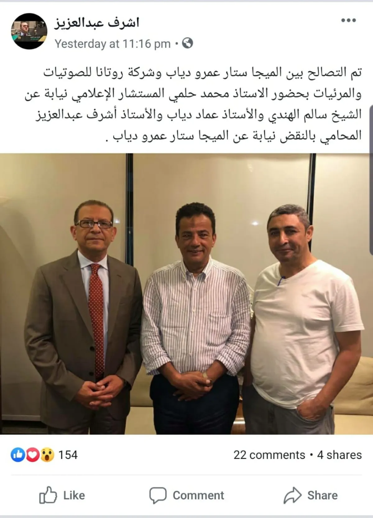 أعلن أشرف عبد العزيز المستشار القانوني للمطرب عمرو دياب، تصالحه بشكل نهائي مع شركة روتانا للصوتيات والمرئيات، وإنهاء كافة النزاعات القانونية بينهما أمام المحاكم الاقتصادية المصرية؟