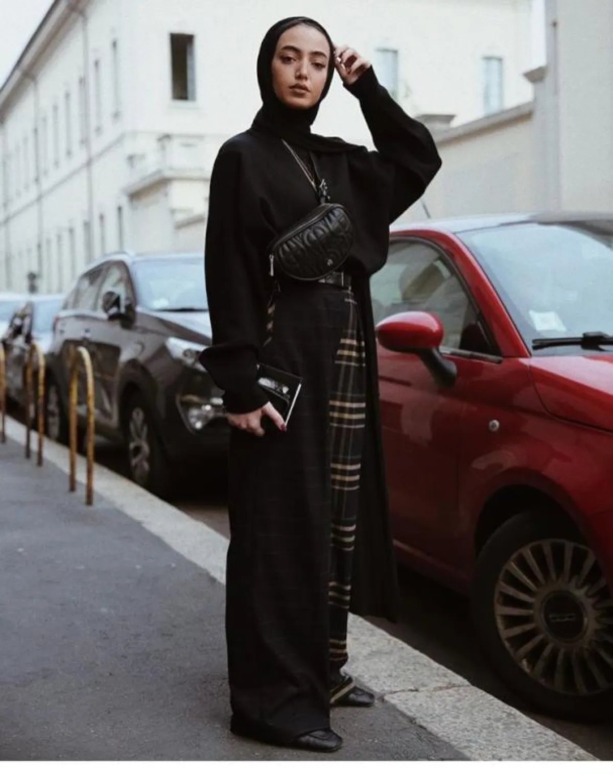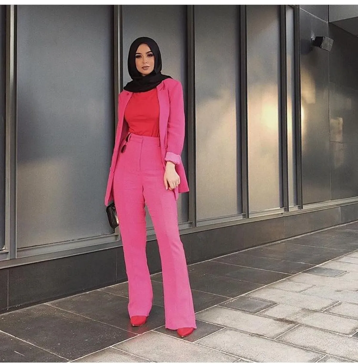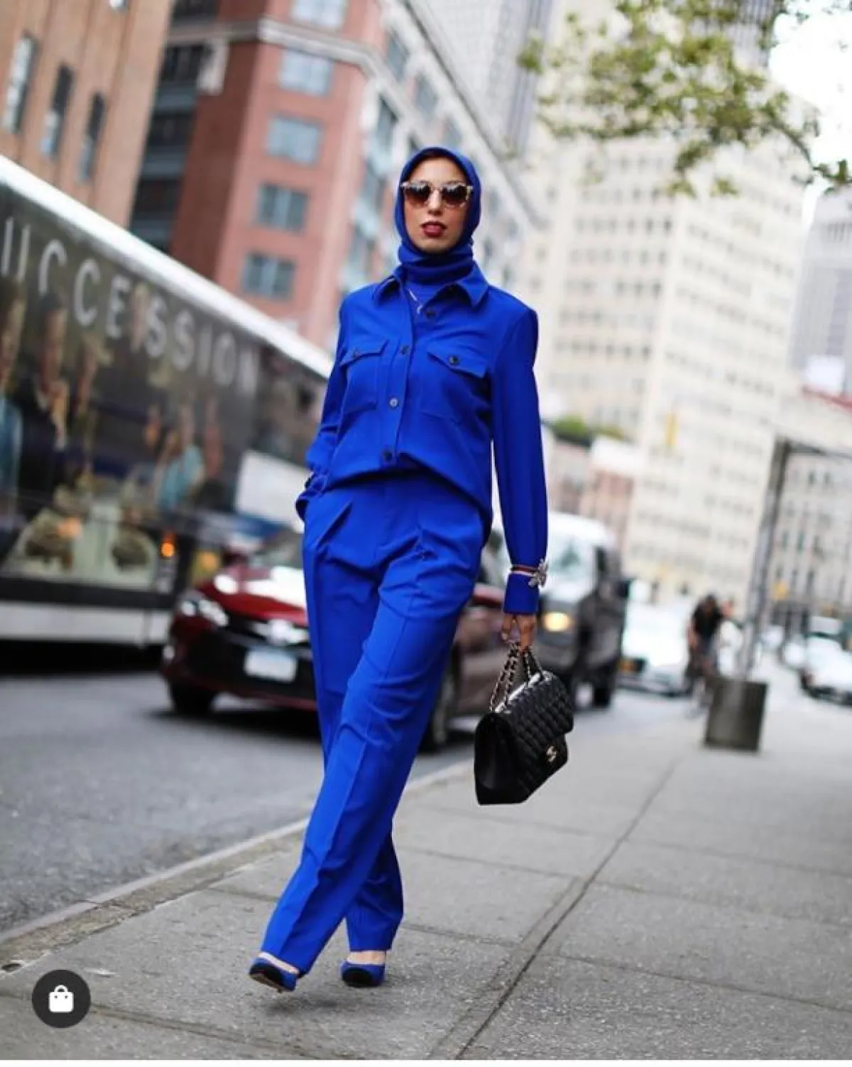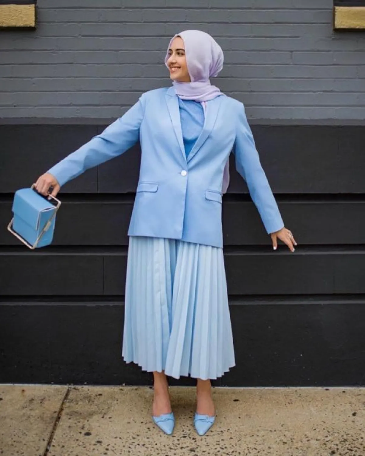 اختارت مدونة الموضة العالمية ميلانيا الترك هذا الستايل باللون الأزرق الزهري للقميص والبنطلون، حتى البلوفر تحت القميص جاء بالدرجة نفسها، وكذلك لون الحجاب والشوز، بينما جاءت السنطة بلون غامق أكثر للكحلي المتدرج من الأزرق، وبالرغم من توحد الألوان القوي، إلا أنها لم تبدُ مزعجة في مظهرها أبدًا .