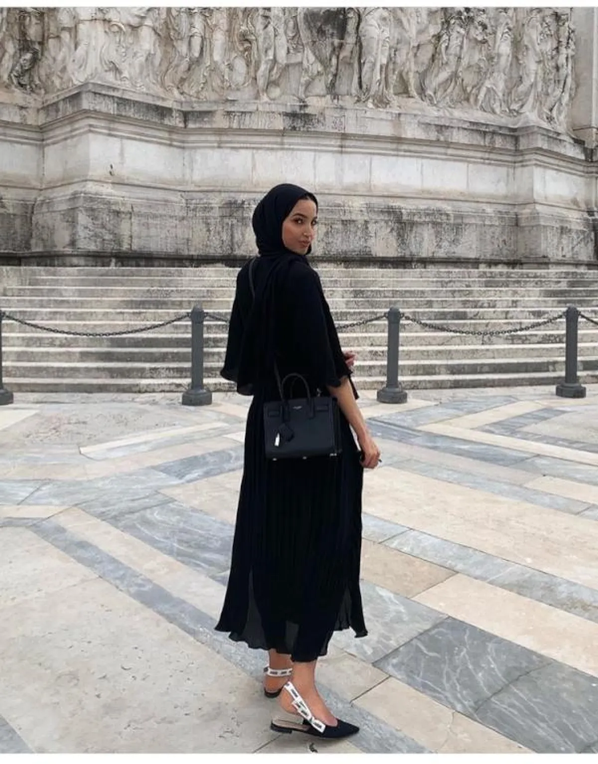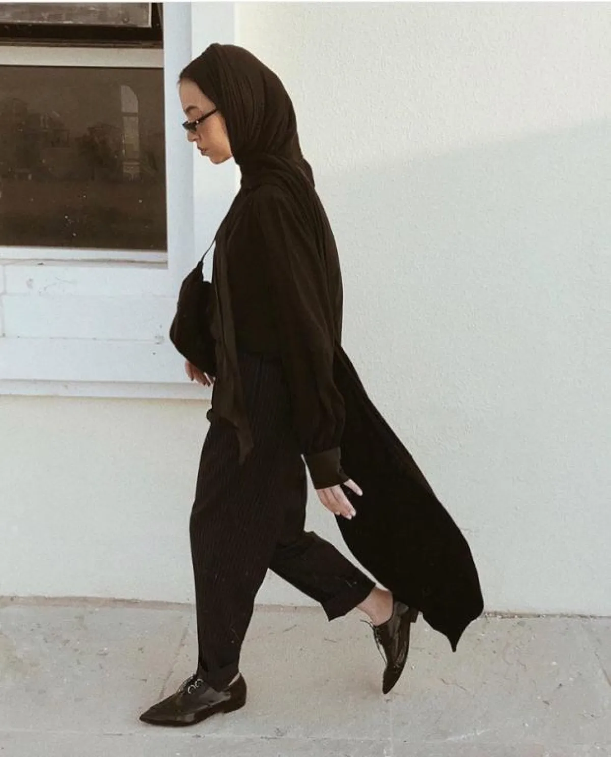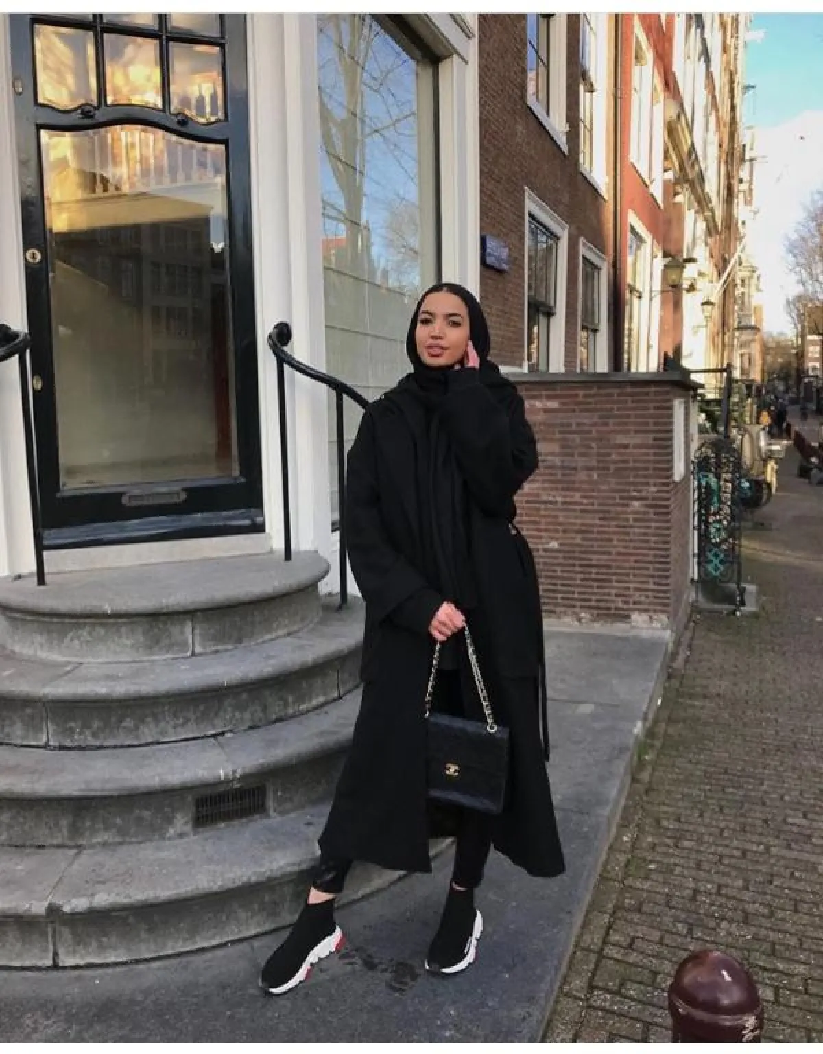 تطبق عادة المدونة لينا الغوطي هذا الأسلوب باعتماد اللون الأسود تحديدًا، أحد ألوانها المفضلة، كهذا اللوك المعطف الطويل، والبنطلون القماشي والحذاء والشوز الأسود، لاطلالة أكثر جدية.