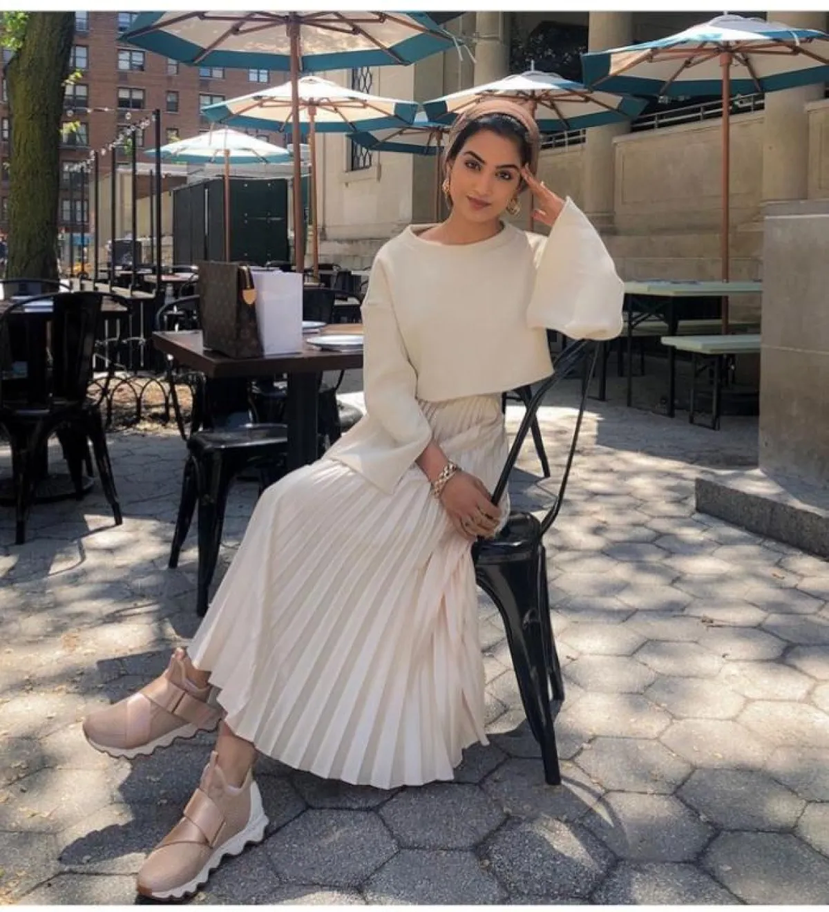 يمكنكِ اعتماد هذا الأسلوب كهذا اللوك البسيط من سالي عاشور بالتنورة والتوب والسنيكرز مع الحجاب، كلها بدرجات النود الكريمي المختلفة، للمسة مخملية ناعمة.