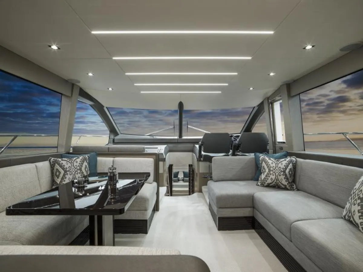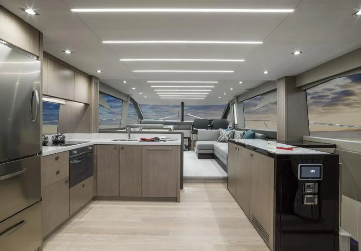 كما يأتي اليخت مجهزًا ببرادات المشروبات، ومنضدة طعام لثمانية أفراد. وعلى سطح اليخت، تنتشر أركان الاسترخاء في الشمس أو في مسبح الجاكوزي الدائري.