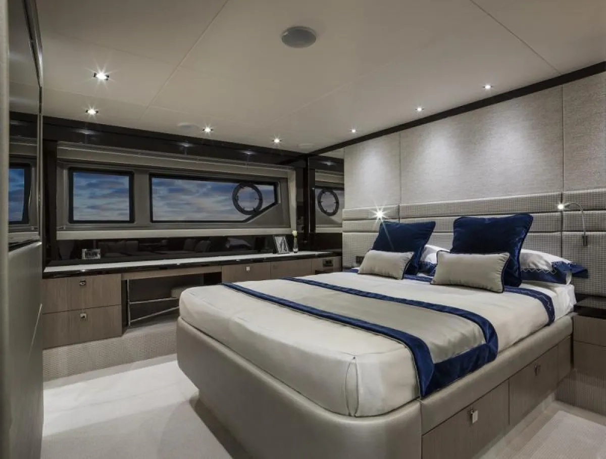 تقع غرفة النوم الرئيسة في منتصف اليخت، ولبلوغها سلم خاص موقعه في الصالون الرئيس. وهي قريبة من المطبخ، وتحتوي على سرير عريض وسجادة فاخرة وأضواء للقراءة، وتلفزيون مسطح بحجم 32 بوصة. وتوجد أريكة ونظام فيديو "دي في دي"، ونظام موسيقى "سراوند". وفي الركن، منضدة تجميل ومقعد صغير، مع براد للمشروبات وخزان للأكواب. وهي غرفة مكيفة، وفيها نقاط للهاتف والكهرباء ومطفئة حريق.