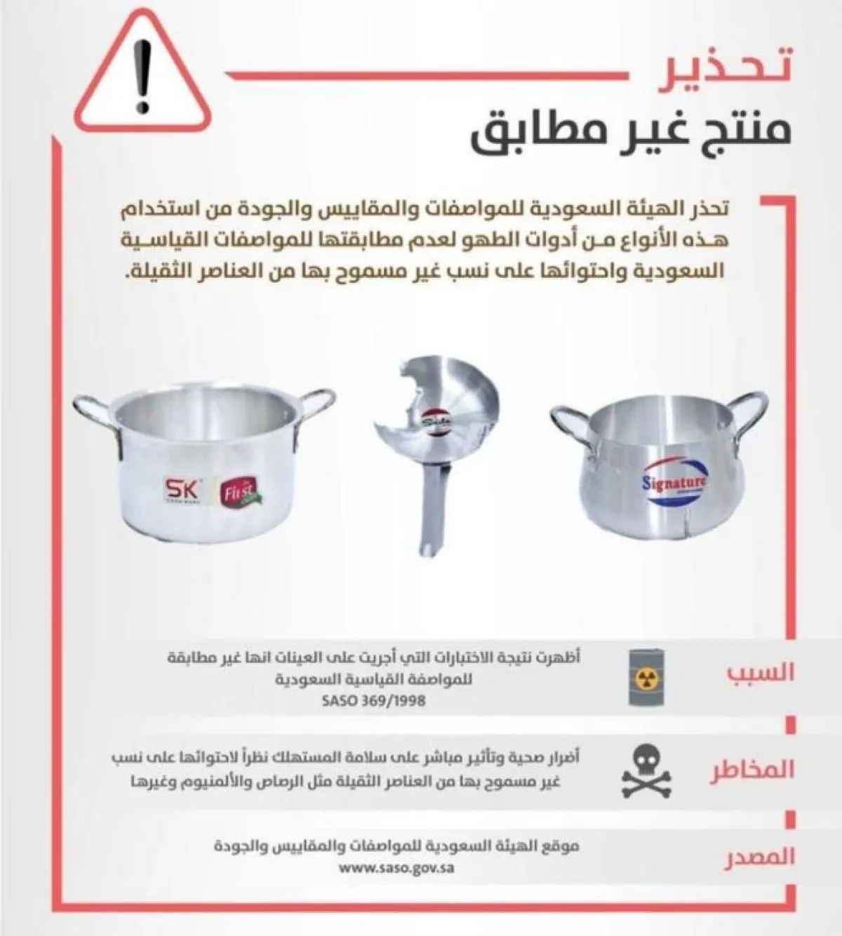 ومؤخراً، حذَّرت الهيئة السعودية للمواصفات والمقاييس والجودة من استخدام ثلاثة أنواع من أدوات الطبخ لعدم مطابقتها المواصفات القياسية، واحتوائها على نِسَب غير مسموح بها من العناصر الثقيلة.