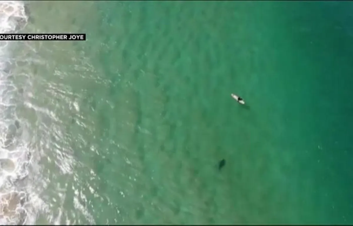 وأضاف جوي، كان طول سمكة القرش يتراوح بين ثلاث وأربعة أمتار وكانت تتسلل للوصول إلى الرياضي قبل رصد الدرون لها.