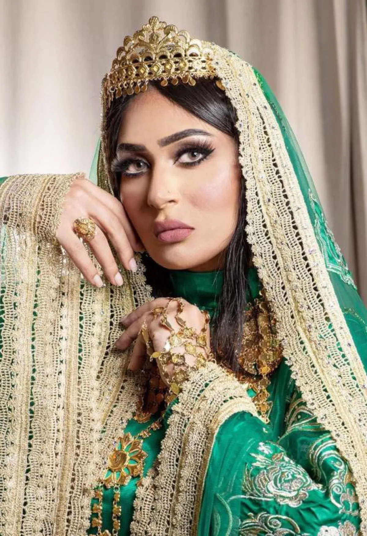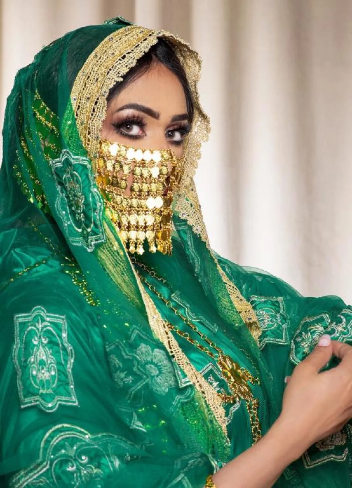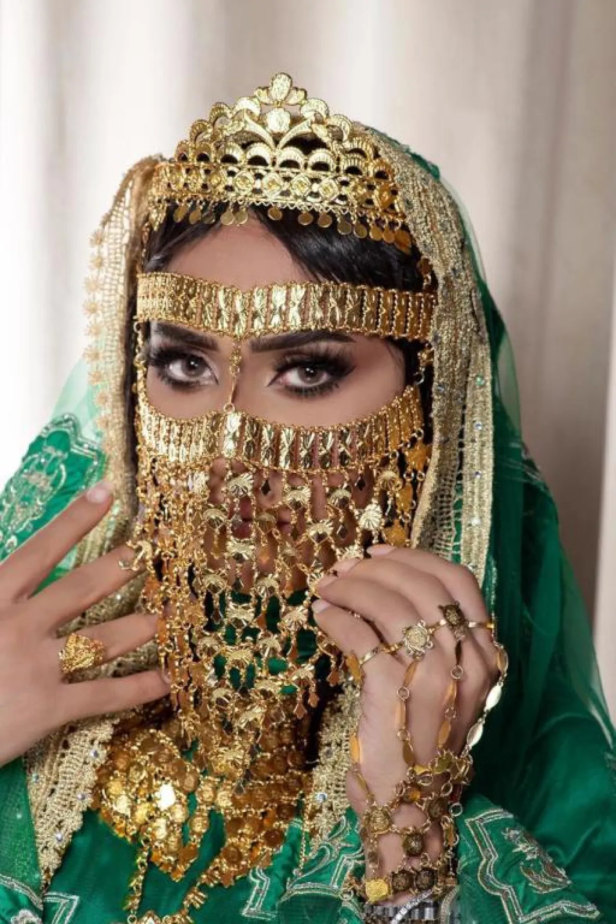 ولطريقة أبسط نسَّقته مع نقاب ذهبي مميز، وفي إطلالة أخرى أكثر أنوثة وجمالاً وضعت التاج وحده؛ لتبرز ملامح وجهها وتفاصيله، في حين اهتمت بمكياجها خبيرة ومدربة المكياج المعتمدة ندى الجهني، واستخدمت لتجميل خديها وشفتيها اللون الزهري، ولتلوين عينيها وضعت اللون الأبيض أسفل الحاجبين، والبني على الجفون، وأكملت زينتها بالرموش الطويلة وقلم الكحل الأسود السائل.