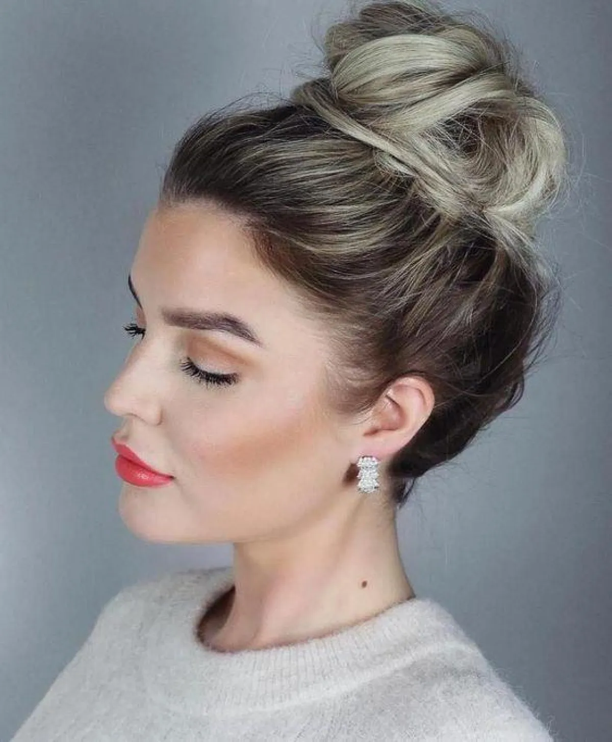 يمكنكِ تجربة تسريحة الكعكة المرفوعة بطريقة فوضوية قليلًا، مع الخصلات المتمايلة، ويفضل أن تكون مع شينيو أو كثافة بسيطة عالية من الأمام، والتي تجعل وجهكِ يبدو أطول مما هو عليه.