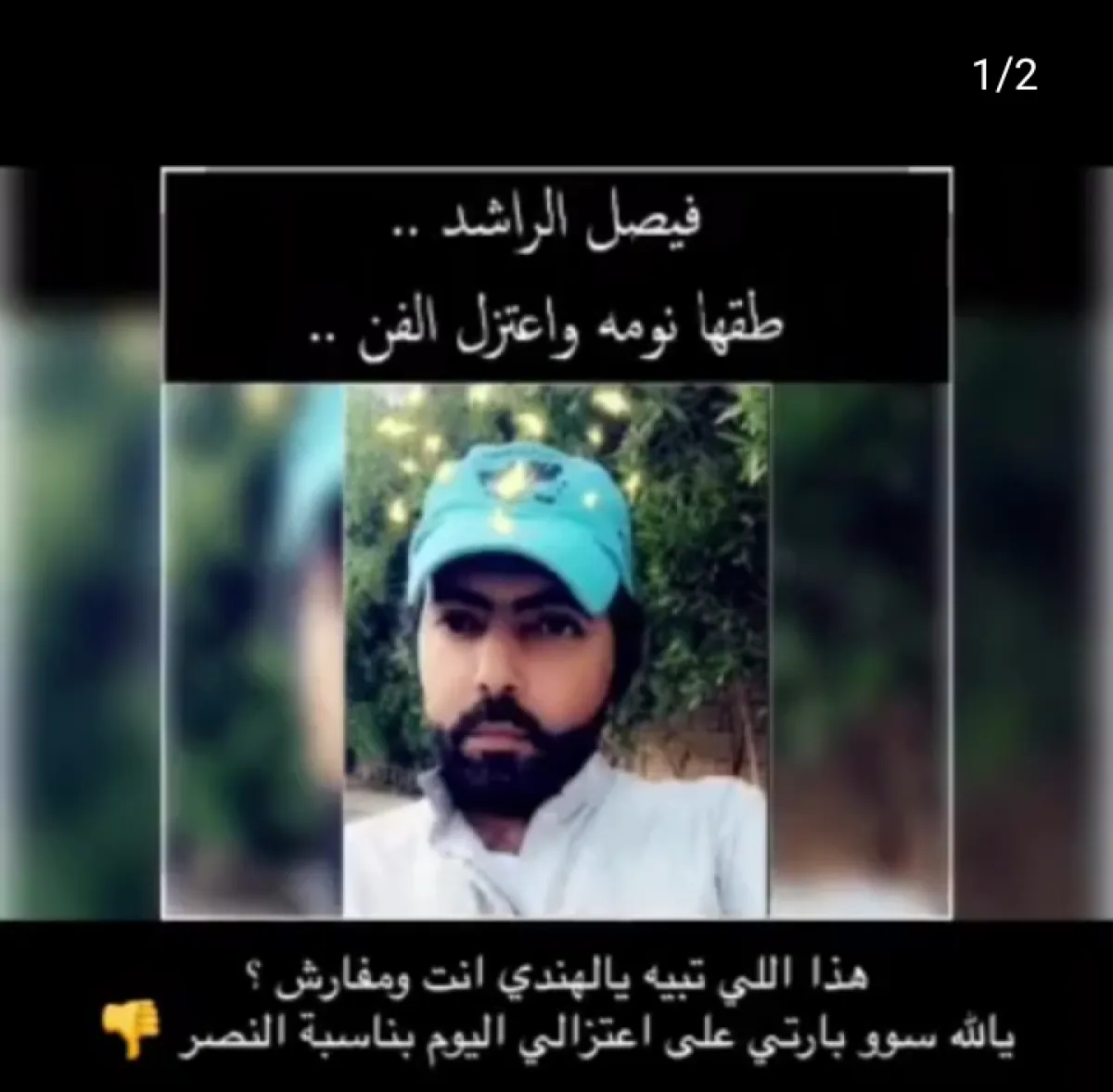 ووجه فيصل الراشد، اللوم إلى الهندي من خلال تعلق نشره على "إنستقرام"، حيث كتب "فيصل الراشد طقها نومه واعتزل الفن، هذا اللي تبيه يا لهندي أنت ومفارش، يالله سووا بارتي على اعتزالي اليوم بمناسبة النصر".