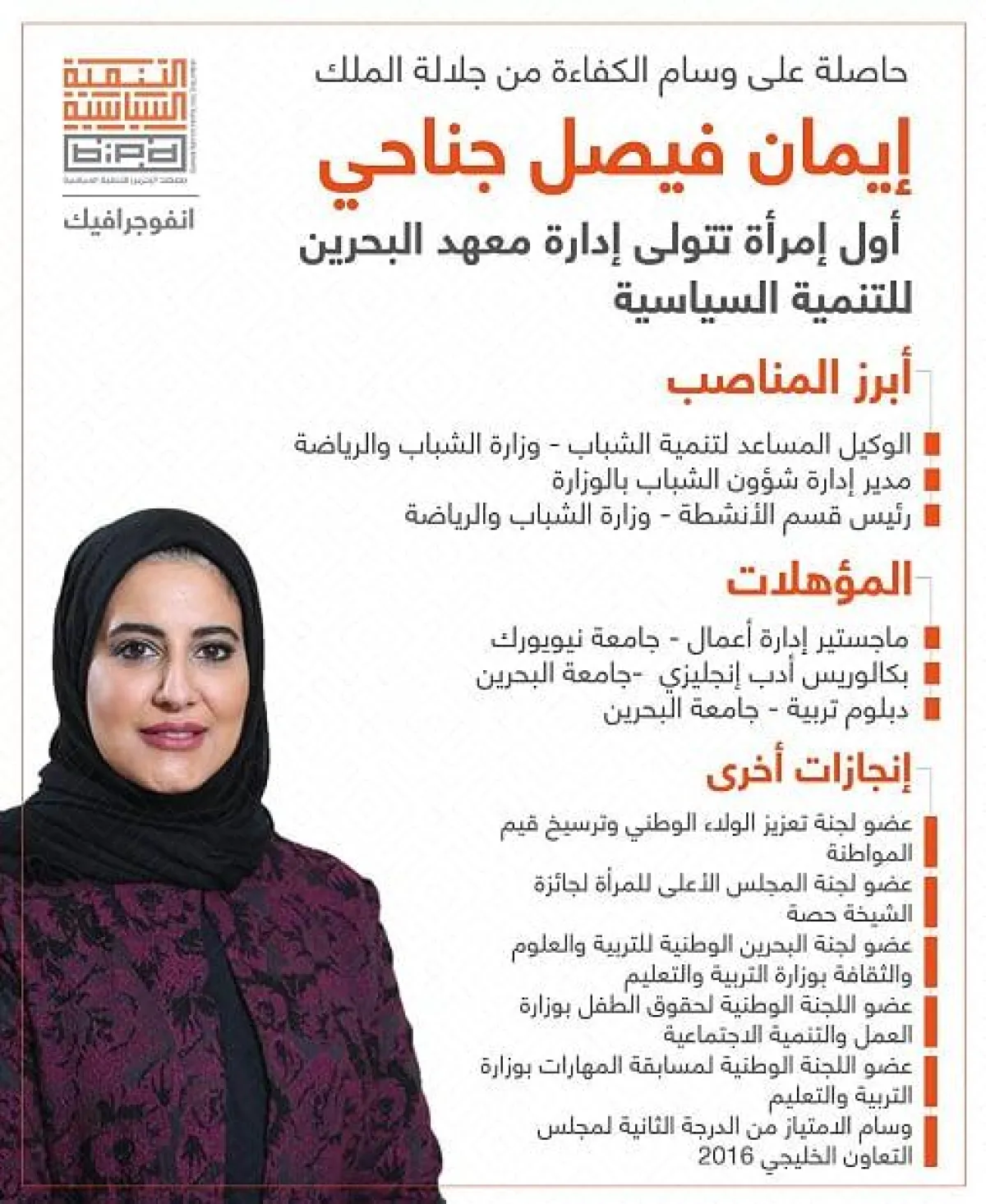 ستكون البحرينية إيمان فيصل جناحي، أول سيدة تتولى منصب المديرة التنفيذية لمجلس أمناء معهد البحرين للتنمية السياسية، وذلك بعد أن وافق المجلس برئاسة وزير شؤون الإعلام «علي بن محمد الرميحي» على تعيين عضوة مجلس الأمناء بالمعهد «إيمان فيصل جناحي» لتولي منصب المديرة التنفيذية للمعهد، اعتباراً من الأول من أكتوبر 2019، ولمدة أربع سنوات.